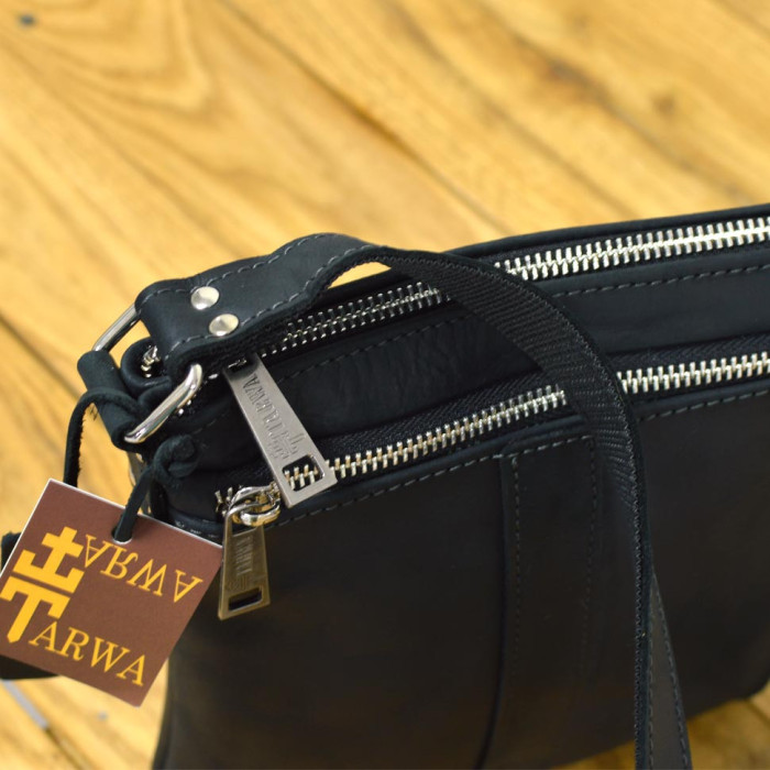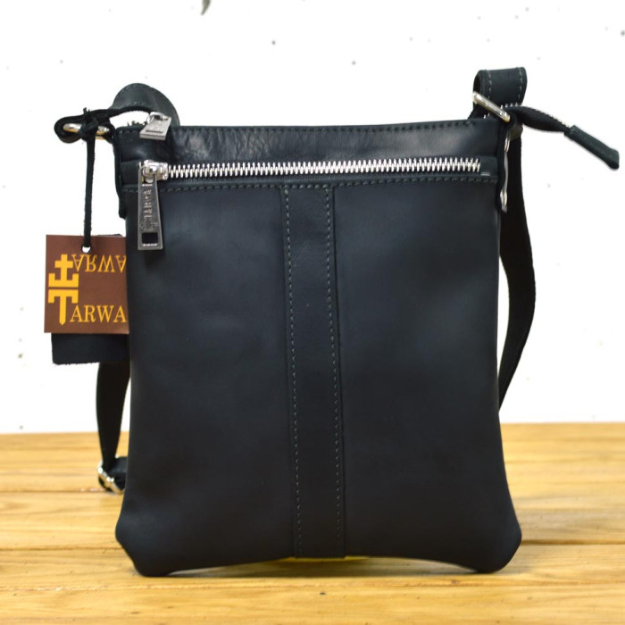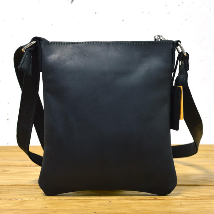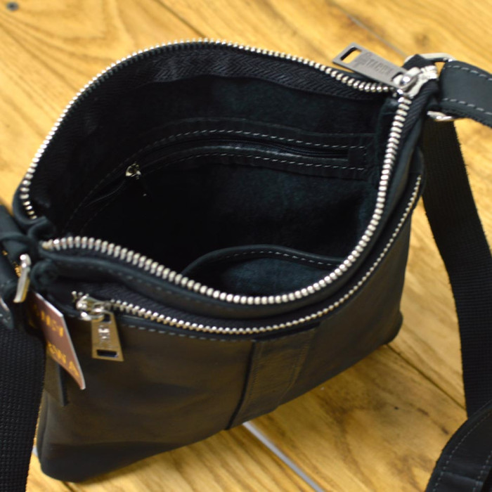 Шкіряна чоловіча сумка через плече класичної прямокутної форми, плоска. Сумка відкритого типу без клапана. Складається з одного основного відділення, що закривається на металеву блискавку. На лицьовій поверхні врізна кишеня на блискавці. Дві внутрішні кишені - потайна на блискавці для документів і грошей і відкритий один. Внутрішній простір сумки через плече продубльовано шкіряною підкладкою замість текстильної, що допоможе сумці служити довго. Шкіряна підкладка значно полегшує як догляд за сумкою, так і її використання.