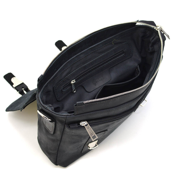 Зовнішня частина сумки месенждера сумки-портфелі закривається на шкіряний клапан на металевих фальш-пряжках, під якими два портфельні замки. На задній частині сумки відділення на блискавці. Шкіряний наплічний ремінь регулюється, що дозволяє підібрати зручне положення. Красива фурнітура кольору бронзи.