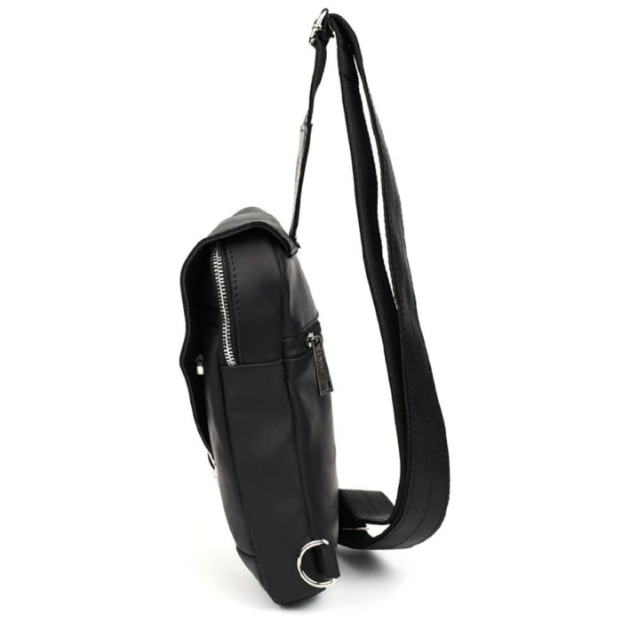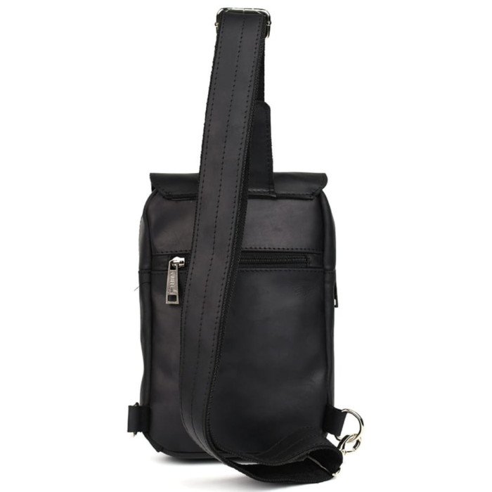 Слінг застібається на блискавку і зверху накривається шкіряним клапаном з ремінцем на магнітній кнопці, а також, як декор, є металева пряжка.