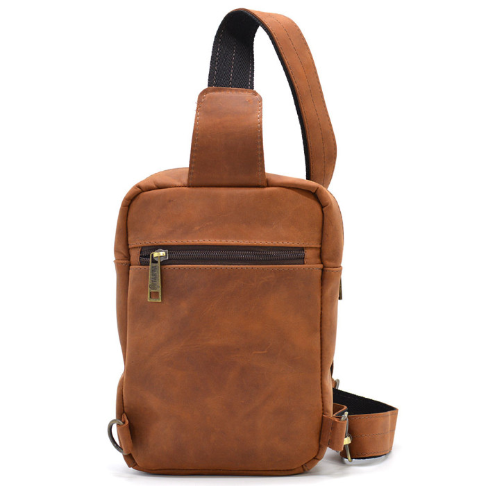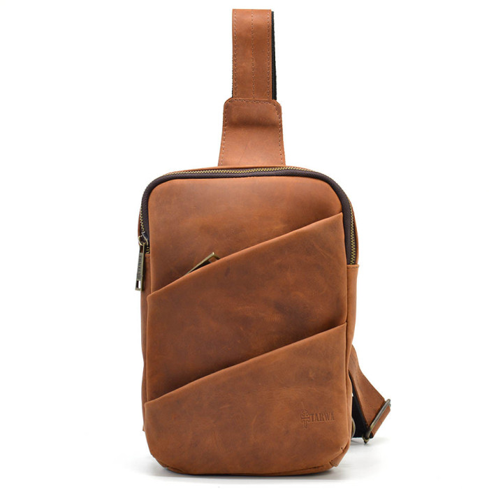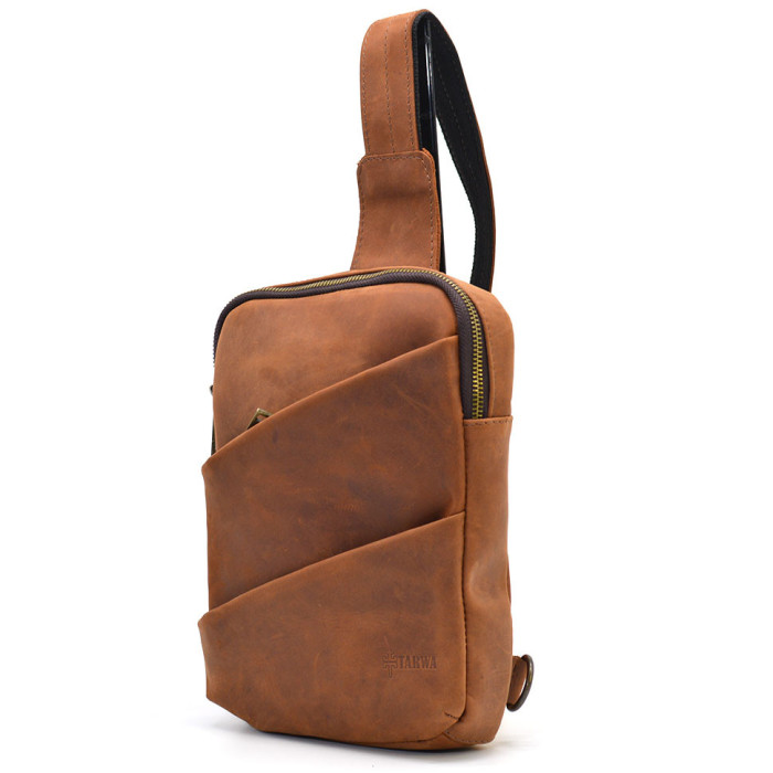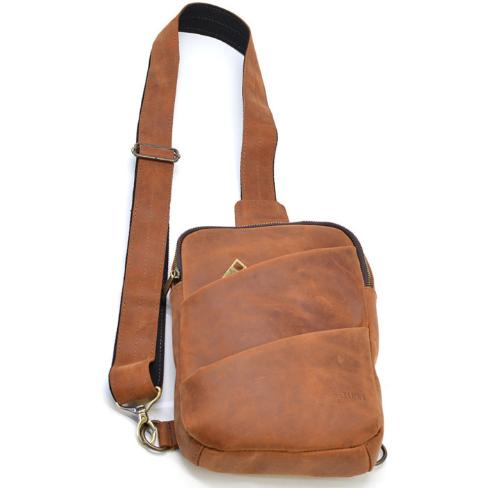 Рюкзак слінг на одну шлейку RB-0604-3md TARWA кінська шкіра. Зручний та практичний аксесуар, виготовлений із натуральної телячої шкіри. Стильна модель ідеально підійде для кожного дня. Аксесуар має одне відділення, всередині якого є врізна кишеня на блискавці.