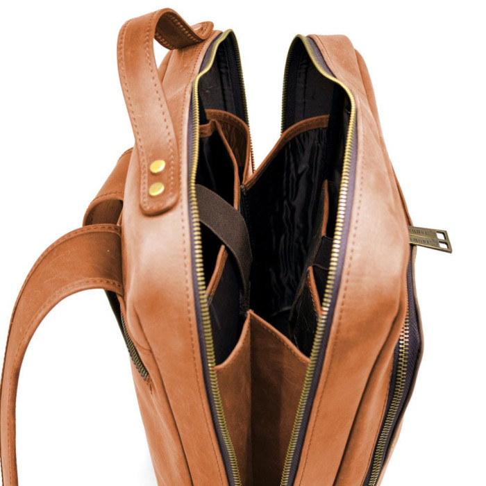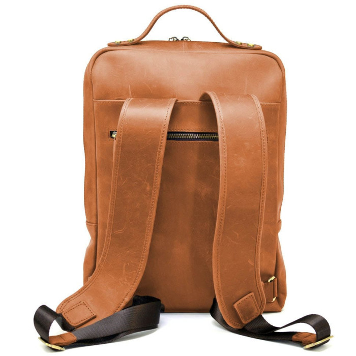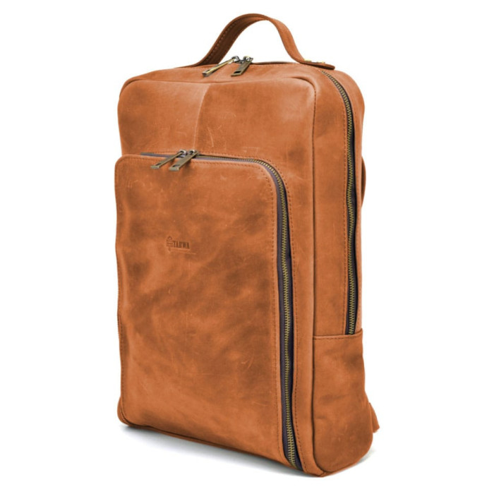 Рюкзак для ноутбука 15" дюймів RB-1240-4lx в коньячній шкірі крейзі хорс, український бренд TARWA. Модель виконана з натуральної кінської шкіри високої якості. Відмінний варіант для роботи, навчання. Універсальна модель, підійде для чоловіків і дівчат. Має одне основне всередині якого є ущільнений відсік для ноутбука діагоналлю до 15", фіксується зверху хлястиком сліпучкою, також є велика кишеня на блискавці і дві відкриті кишені поменше для дрібних предметів. На лицьовій частині рюкзака розташована кишеня на блискавці з двома бігунками для зручності використання. На спинці рюкзака є врізна кишеня на блискавці. Якісна брендована фурнітура у кольорі срібло. Зверху зручна ручка для перенесення аксесуарів у руці. Завдяки широким шкіряним ременям на плечах, навантаження рівномірно розподіляється на спину.