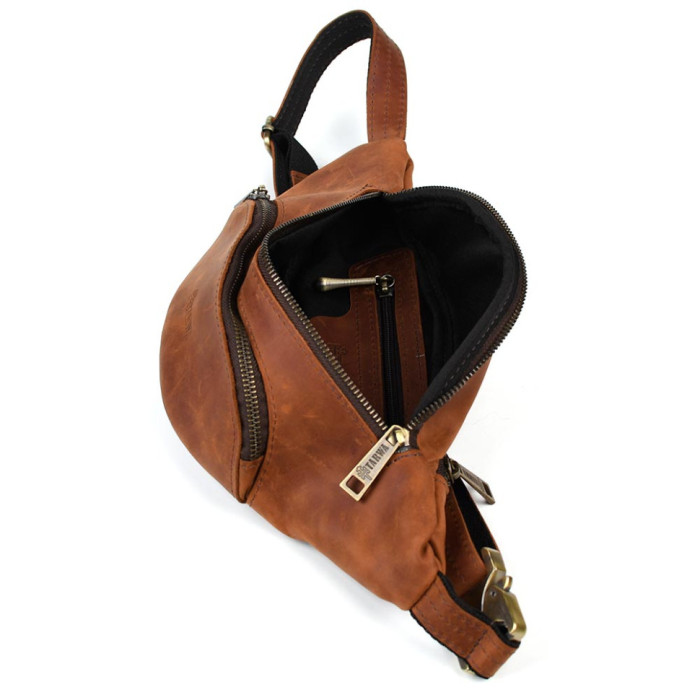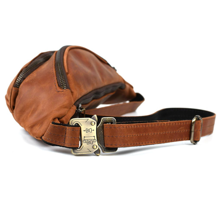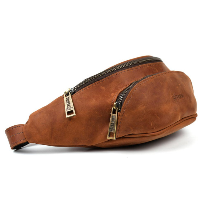 Шкіряна бананка з передньою кишенею RB-30351-3md TARWA. Модель призначена для прогулянки, поїздки чи подорожі – і всі необхідні речі завжди під рукою. Має два великі відділи на блискавках, передня накладна кишеня на блискавці. Шкіряний ремінь з регулюванням довжини та тактичний швидкознімний фастекс Кобра в кольорі антик.