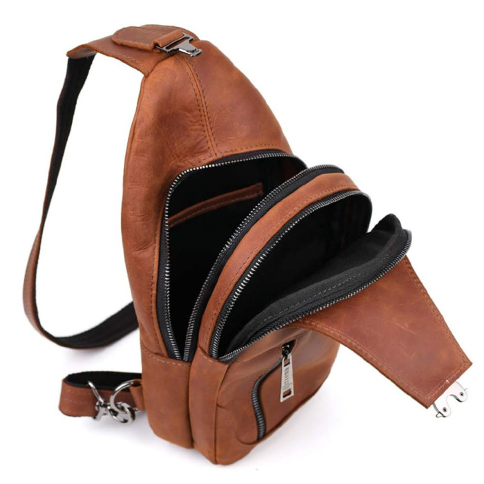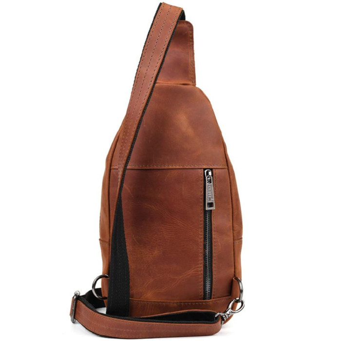 Рюкзак слінг RB-4004-3md TARWA виконаний із якісної натуральної шкіри "Крейзі" матової фактури. Вироби з такої шкіри в процесі використання набувають оригінального вінтажного вигляду.