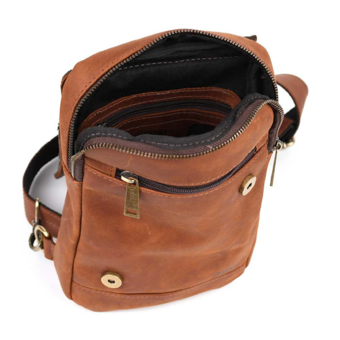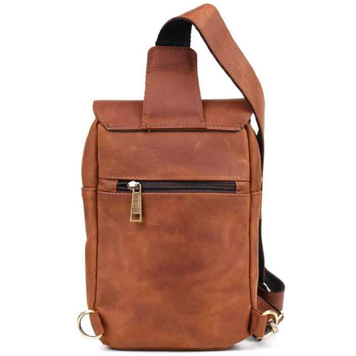 Чоловічий міні-рюкзак на одну шлейку RB-6403-4lx TARWA, з натуральної кінської шкіри. Зручний та практичний аксесуар підходить для щоденного використання. Може вміщувати документи формату А5. Сумка на одне відділення з тканинним підкладом. Усередині є врізна кишеня для документів чи інших цінних предметів. На лицьовій стороні рюкзачка розташовується врізна кишеня на блискавці. Виріб застібається на блискавку і зверху накривається шкіряним клапаном з ремінцем на магнітній кнопці, а також, як декор, є металева пряжка. На задній стороні сумки є ще одна врізна кишеня. Рюкзак оснащений шкіряною моно-шлейкою з текстильною основою, що запобігатиме її розтягуванню. Ремінь регулюється по довжині, а завдяки карабіну перестібається на право/ліво.