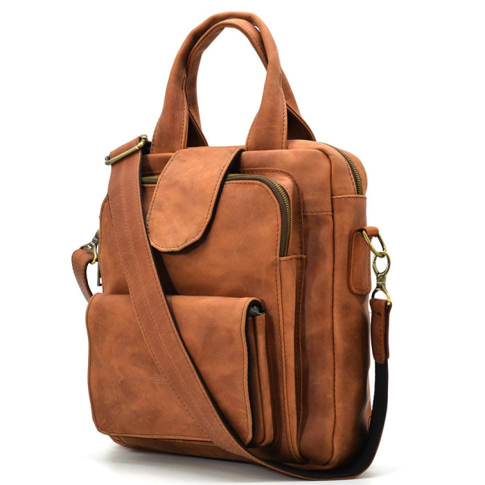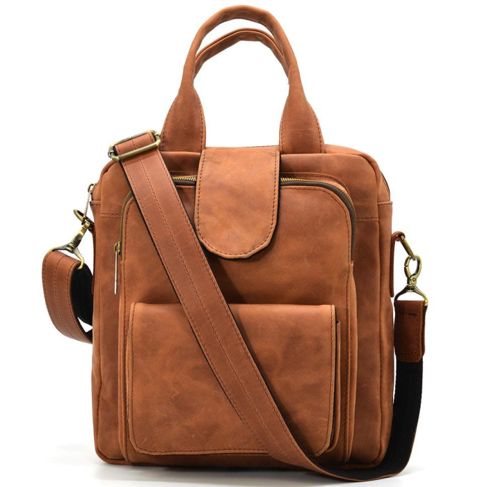 Сумка вертикальна для чоловіків з натуральної телячої шкіри RB-7266-3md TARWA дуже містка завдяки просторому внутрішньому відділенню. Сумка дозволить Вам переносити документи, книги, планшет та багато іншого. Усередині виробу є кілька кишень для зберігання дрібних предметів, на блискавці і без, і спеціальна велика кишеня для гаджета, всередині обшита міцною тканиною. Зовні на задній стороні сумки є врізна кишеня на змійці, а на лицьовій стороні є кишеня, яка закривається блискавкою і клапаном з магнітом і ще одна кишеня з клапаном, що застібається магнітними кнопками. Це дуже зручно.