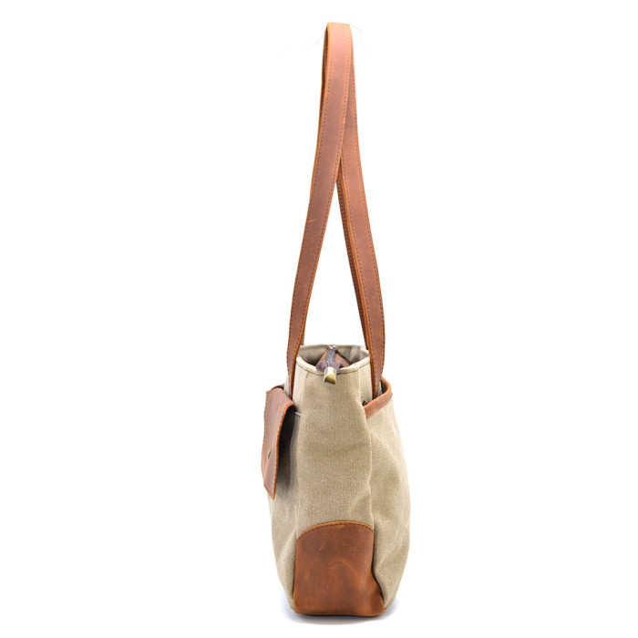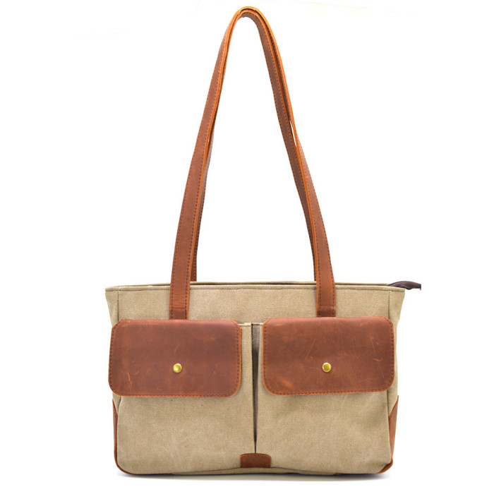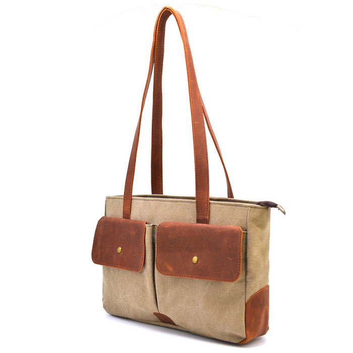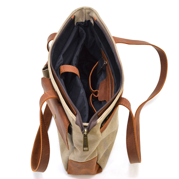 Жіноча сумка тоут з канвасу та шкіри TARWA RBs-3930-3md з передніми кишенями з клапанами. Одне відділення на блискавці. Подовжені ручки для зручності носіння на плечі, повністю шкіряні. Всередині відділ для ноутбука, кишеня на блискавці, дві відкриті кишені