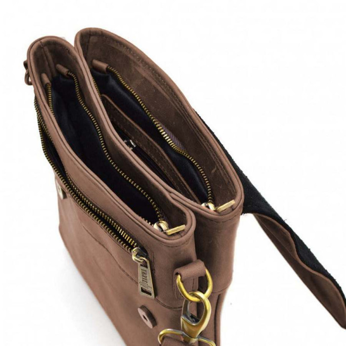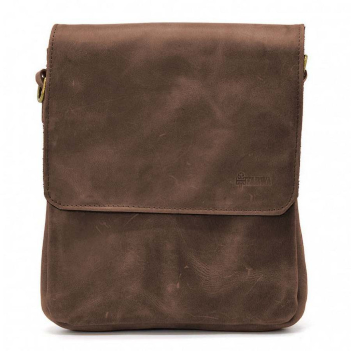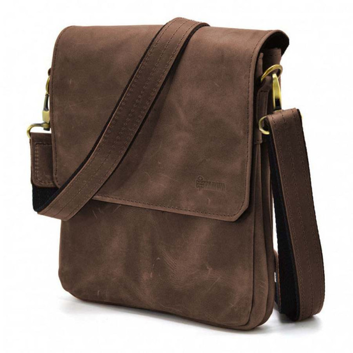 Чоловіча сумка через плече RC-0022-4lx TARWA на 2 відділення кінська шкіра з клапаном. Модель може вміщувати документи формату А5 та планшет. Виріб виготовлений із натуральної кінської шкіри. Сумка складається із двох відділень, що застібаються за допомогою шкіряного клапана, з магнітними кнопками. Усередині є врізна і відкрита кишені в одному відділенні, і ще одна відкрита ховається під клапаном. На задній стороні є врізна кишеня на блискавці. Аксесуар зручно носити на плечі завдяки плечовому ременю з регулюванням довжини.