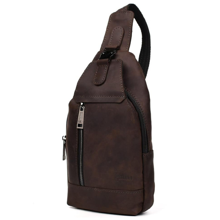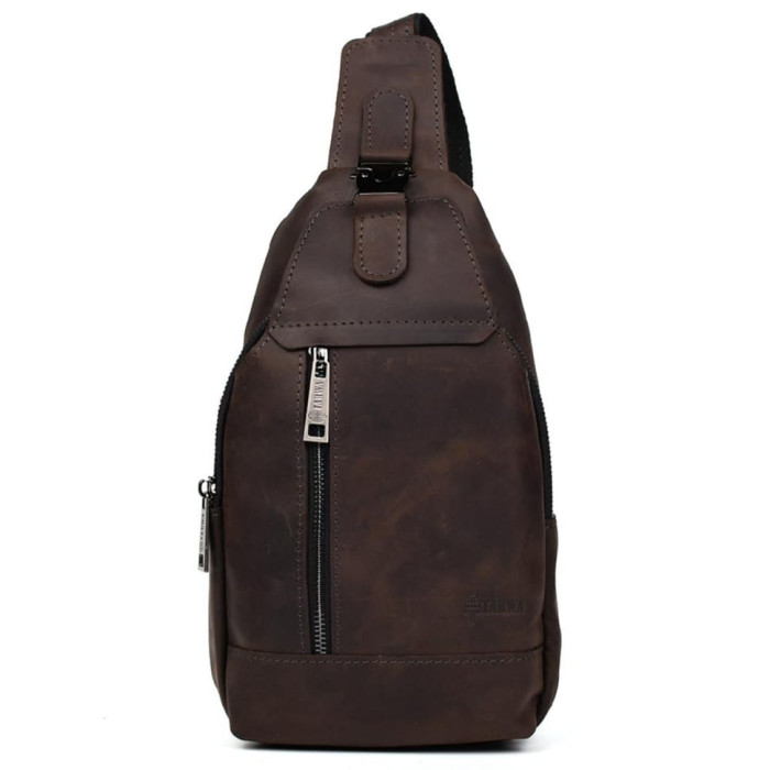 Чоловічий рюкзак слінг шкіряний коричневий TARWA RC-0116-3md Чоловічий рюкзак слінг шкіряний TARWA 0116 - зручний слінг на одну шлейку на ліве або праве плече. Одне основне велике відділення на блискавці та друге відділення дещо менше під клапаном із фастексом. Передня вертикальна кишеня на блискавці, кишеня на блискавці на задній стороні горизонтальна.
