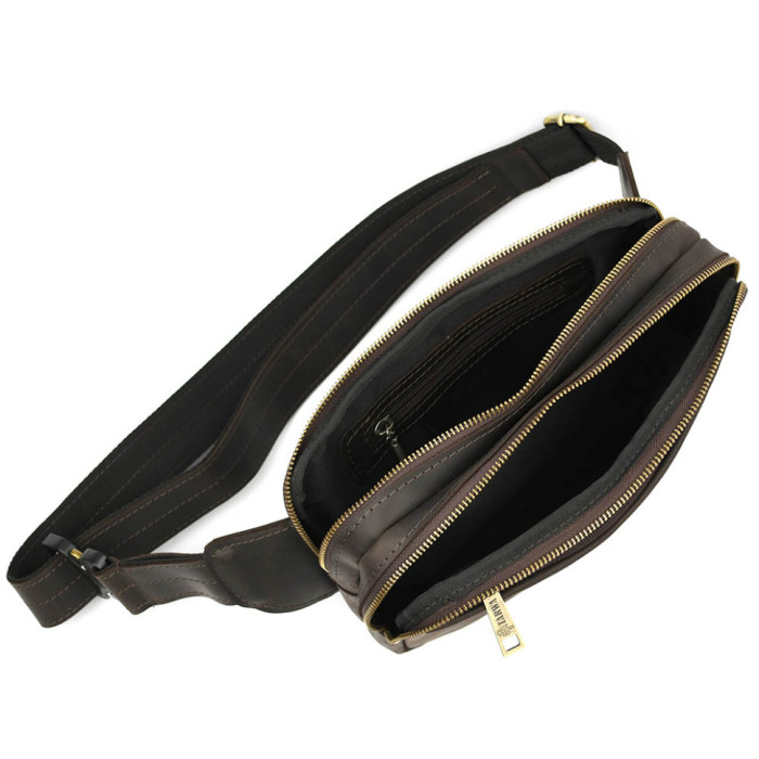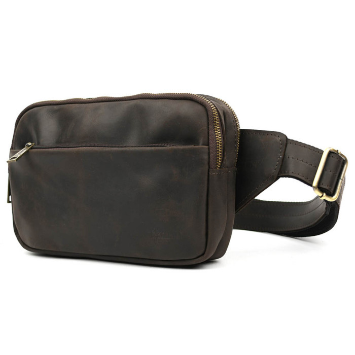 Від українського виробника TARWA. Стильна напоясна шкіряна прямокутна сумка на кожен день, у поїздці та на прогулянці. Сумка-бананка шкіряна 0741 складається з двох окремих великих відділень, що застібаються на блискавці. Зовнішній бік доповнює кишеню практично на всю лицьову поверхню, що також застібається на блискавку. На задній стороні є врізна кишеня. Ремінь виконаний повністю зі шкіри із текстильною основою. Застібка (фастекс) металева та надійна. Текстильна міцна підкладка. Ця модель є збільшеною версією сумки RC-0704-3md. Шкіра - матова коричнева, колір блискавки - антик