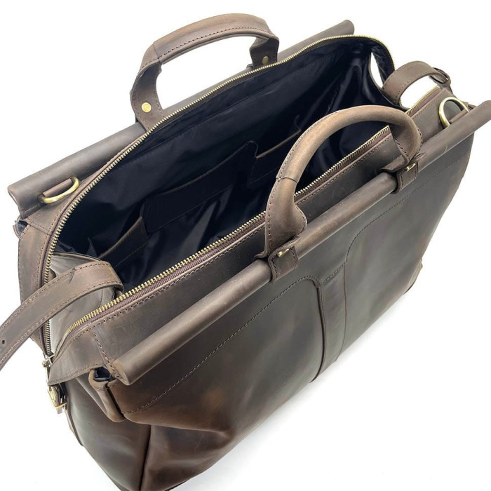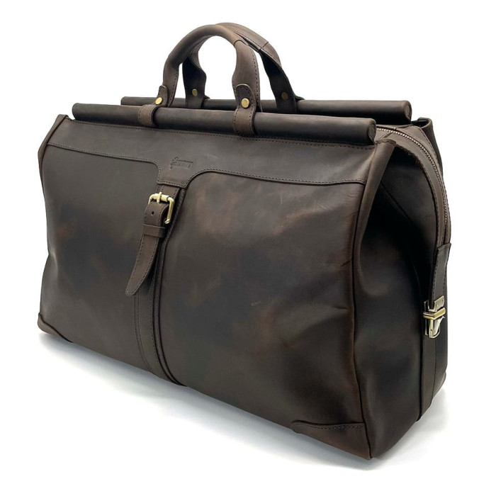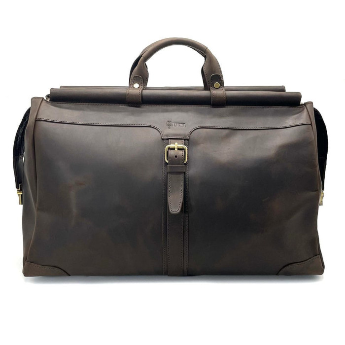 Саквояж великий із натуральної кінської шкіри RC-1403-4lx TARWA коричневий, від українського бренду TARWA. Яскравий, стильний та якісний аксесуар для людей, які не бояться виділитися з натовпу. Саквояж буде корисним у будь-якій поїздці чи подорожі. Виріб має одне відділення, з безліччю кишень: три шкіряні відкриті кишені для портмоне, смартфона та інших дрібних предметів, ще й велика кишеня з блискавкою, для цінних паперів і документів. Також, усередині пришитий шкіряний ремінець-обмежувач, для збереження форми виробу. Саквояж застібається на блискавку із двосторонніми бігунками. Сумка оснащена двома короткими шкіряними ручками, надійно прикріпленими до саквояжної фурнітури, повністю обтягнутої шкірою, що надає виробу особливого шарму. У комплекті є плечовий, шкіряний, знімний, ремінь на карабінах, з регулюванням довжини. На лицьовій стороні аксесуара розташовується декоративний ремінець із пряжкою. У виробі використана металева фурнітура, шкіра вищого ґатунку та міцний тканинний підклад.