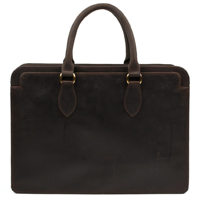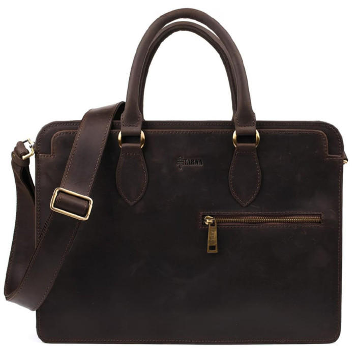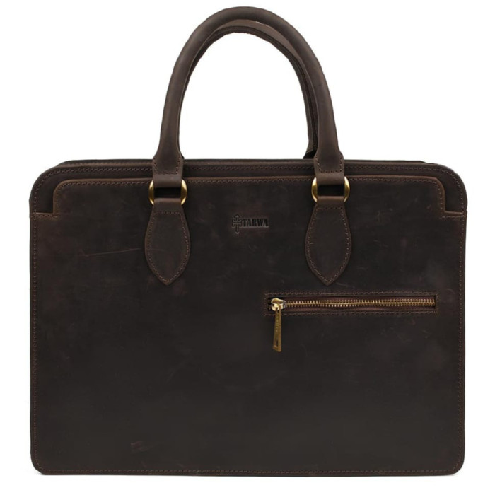 Шкіряний діловий портфель RC-4864-4lx TARWA, коричневого кольору, з двома ручками, для носіння в руці. Місткий класичний портфель, дві ручки, зовнішня врізна кишеня на блискавці. У комплектності відсутній ремінь на плечі. Усередині виріб складається з одного відділу, всередині якого є велика кишеня на блискавці, і ще три шкіряні невеликі кишені для телефону та документів. Сумка виконана з вищого ґатунку телячої шкіри, з використанням щільної текстильної підкладки та якісної металевої фурнітури. Обидві зовнішні сторони аксесуара мають плоску кишеню на всю поверхню і можуть вмістити формат А4, закриваються магнітною кнопкою.