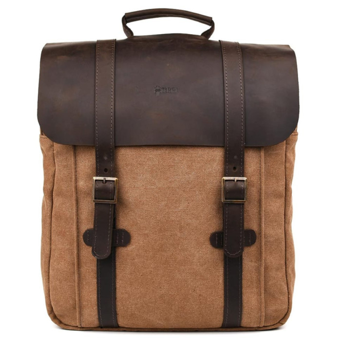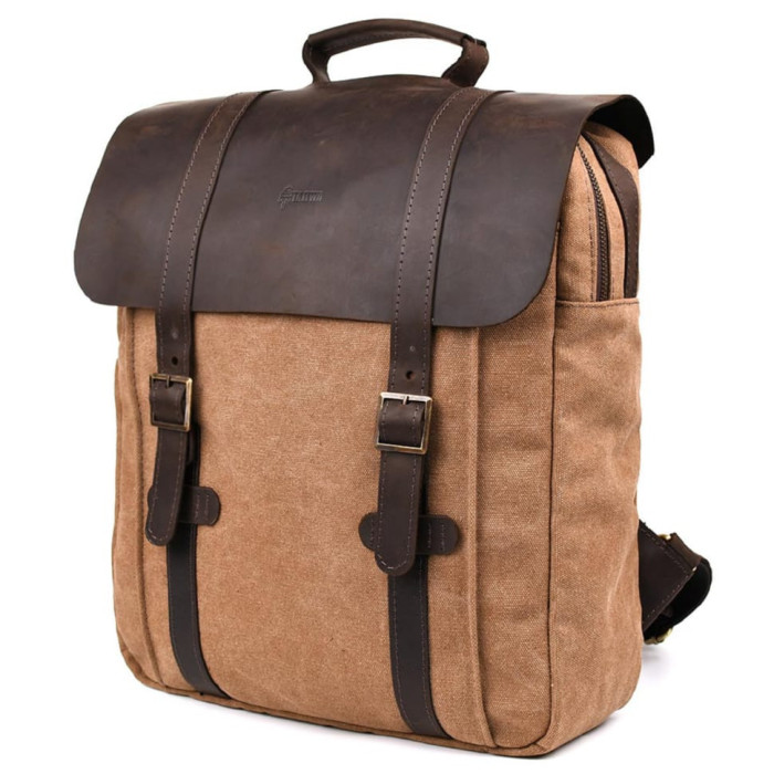 Канвас рюкзак із шкіряною ручкою 3420 - протягується через клапан назовні. Стильний рюкзак з парусини для ноутбука, для документів і речей.