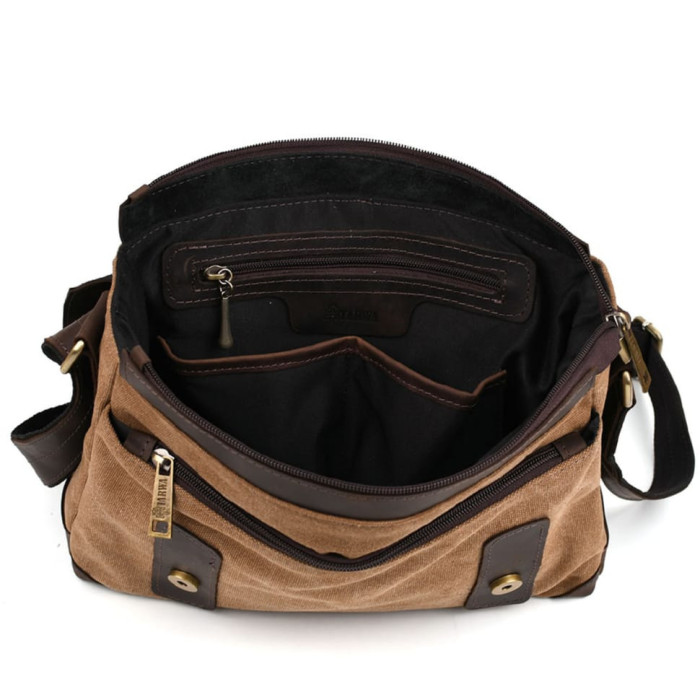 Чоловіча сумка через плече з канвасу та шкіри RСс-6002-3md TARWA Чоловіча повсякденна сумка через плече зі шкіри та канвасу, виробник – український бренд TARWA. Месенджер має одне основне відділення з відсіком для документів або інших важливих предметів, також має передню кишеню, яка знаходиться під клапаном.
