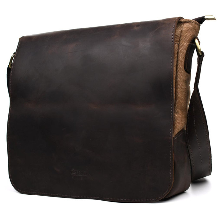 Зручний варіант для роботи, навчання чи поїздок. Вміщує формат А4. Виріб на відділення з внутрішнім ущільненим відсіком на липучці для планшета або документів. Усередині є дві відкриті невеликі кишені для телефону та портмоне, ще містка кишеня на блискавці для цінних предметів. На задній стороні сумки розташовуються дві величезні плоскі кишені: одна на блискавці, і друга на магнітній кнопці. А також під клапаном ще є велика відкрита кишеня. Месенджер застібається на блискавку і зверху накривається шкіряним клапаном із магнітами.