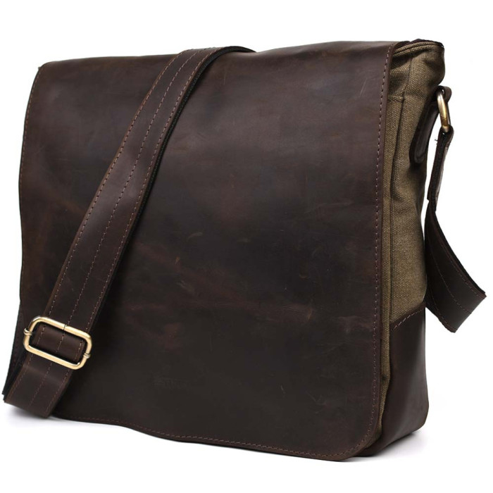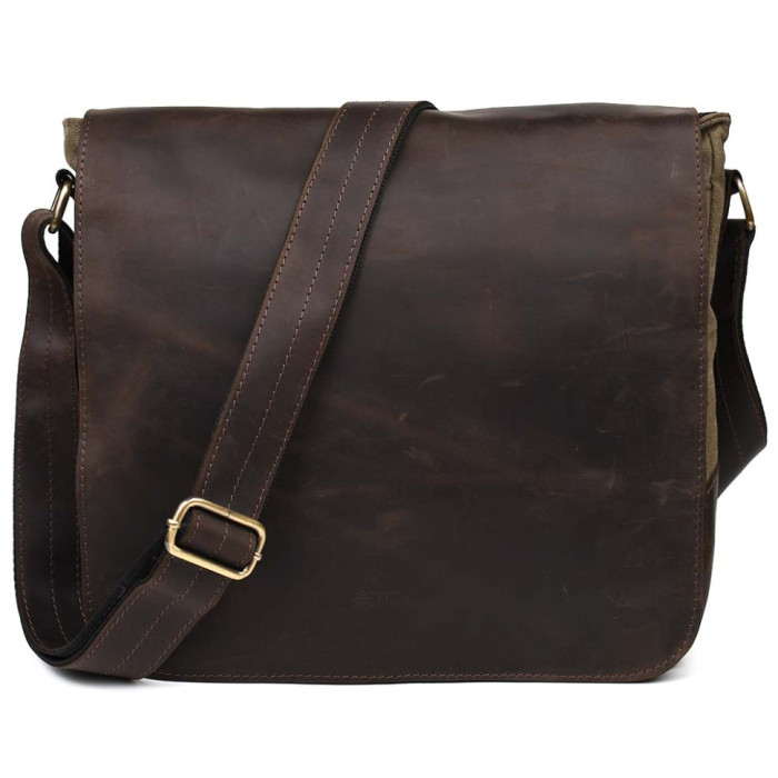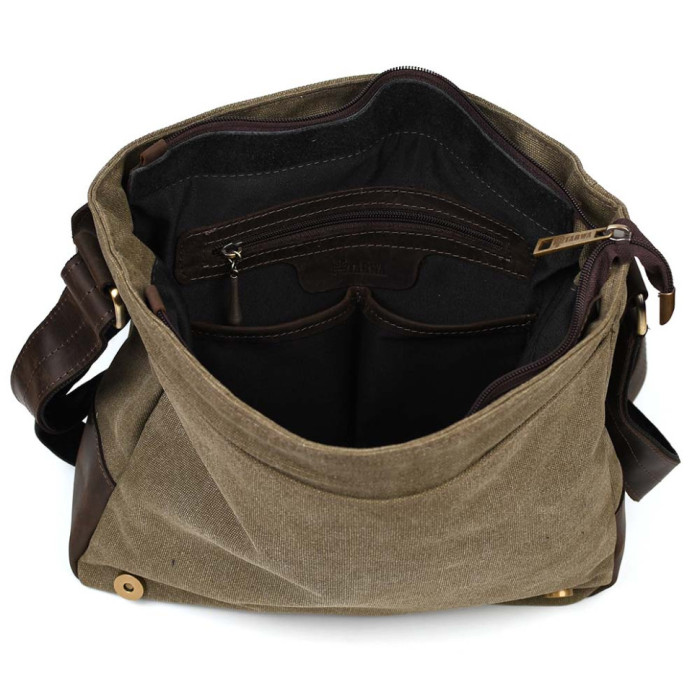 Зручний варіант для роботи, навчання чи поїздок. Вміщує формат А4. Виріб на відділення з внутрішнім ущільненим відсіком на липучці для планшета або документів. Усередині є дві відкриті невеликі кишені для телефону та портмоне, ще містка кишеня на блискавці для цінних предметів. На задній стороні сумки розташовуються дві величезні плоскі кишені: одна на блискавці, і друга на магнітній кнопці. А також під клапаном ще є велика відкрита кишеня. Месенджер застібається на блискавку і зверху накривається шкіряним клапаном із магнітами.