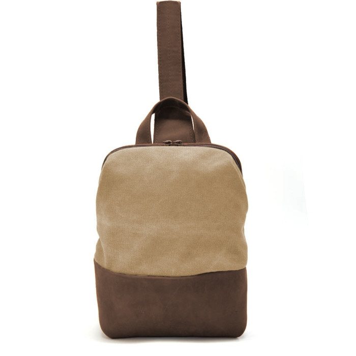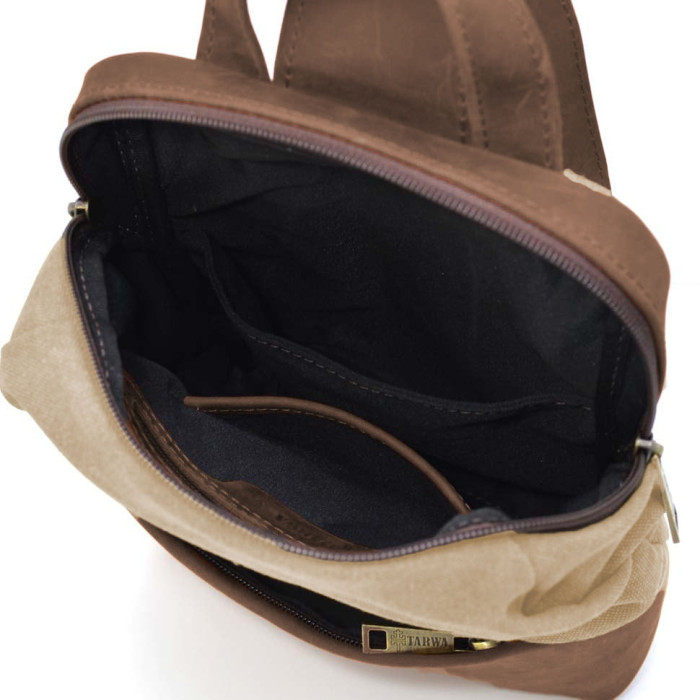 Рюкзак-слінг RСs-1905-3md має компактний та ергономічний дизайн, розроблений українським брендом «TARWA». Модель скомбінована з високоякісної натуральної шкіри Crazy Horse та канвасу (бавовняної тканини) і має такі переваги в порівнянні з цільним шкіряним виробом: