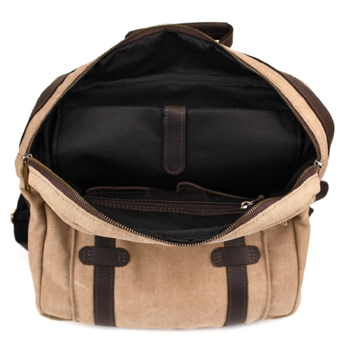 Всередині рюкзака з канвасу 3420 від ТАРВА багате наповнення. Кишеня для ноутбука на липучці, кишеня на блискавці для важливих документів, дві відкриті кишені зі шкіряними торцями для довговічності.