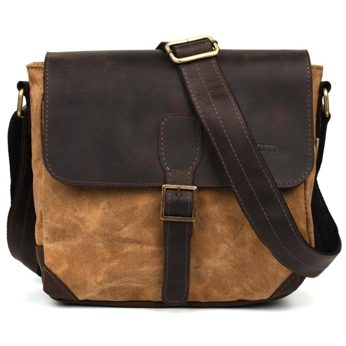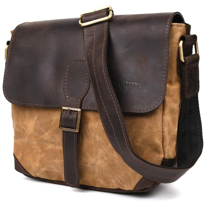 Сумка-меседжер через плече чоловіча, водостійкий канвас та шкіра RCw-1309-4lx TARWA Сумка-меседжер від бренду TARWA виконана у комбінації шкіри та водостійкого вощеного канвасу (парусини). Незамінний аксесуар для кожного дня. Одне основне відділення, в якому: одна кишеня на блискавці та дві кишені для дрібних аксесуарів. Підкладка виконана із щільної тканини. Якісна, міцна фурнітура з логотипом бренду у кольорі антик.