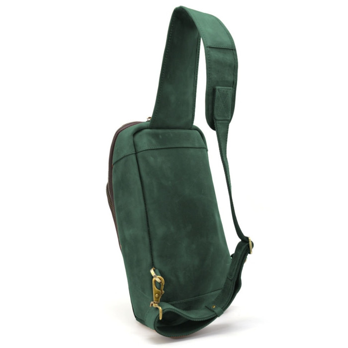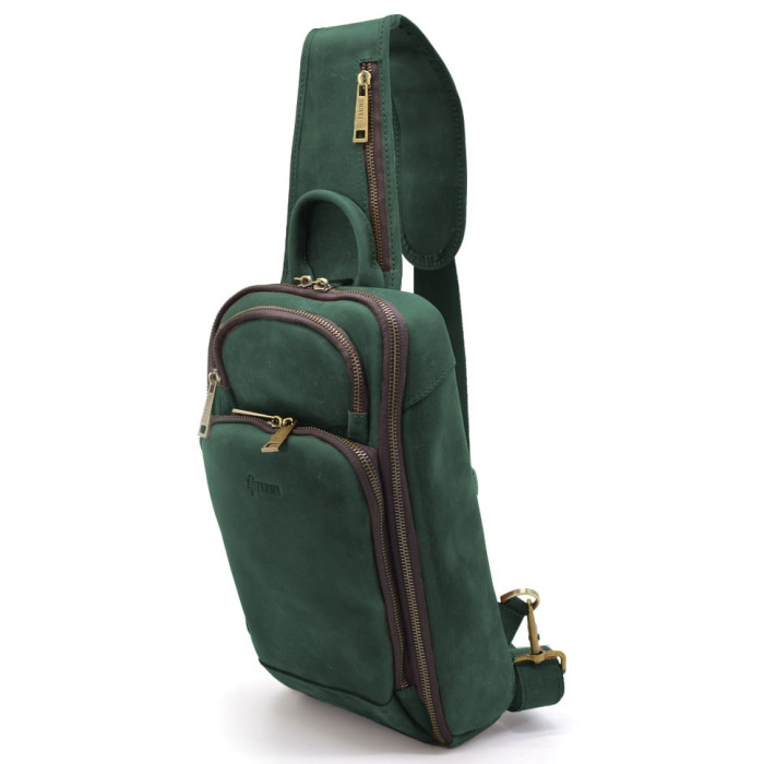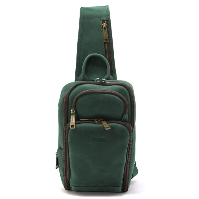 Шкіряний рюкзак слінг на одне плече TARWA RE-0910-4lx зелений. Стильний аксесуар виготовлений із натуральної шкіри Crazy horse, у насиченому зеленому кольорі. Невеликий розмір рюкзак призначений для повсякденного використання. Основне відділення відчиняється на всю ширину. Усередині безліч кишень, органайзерів. Передня кишеня на блискавці. Шлейка перестібається як на ліву, так і праву руку. Стильний аксесуар виготовлений із натуральної шкіри Crazy horse, у коричневому кольорі. Середній розмір рюкзак призначений для повсякденного використання. Його можна взяти із собою у поїздку.