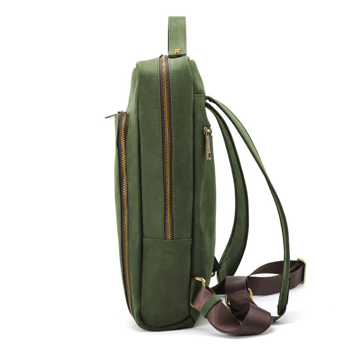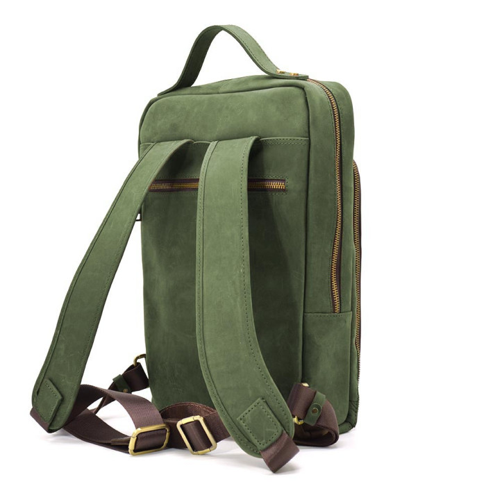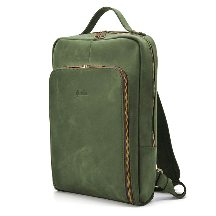 Leather laptop backpack 14" RE-1239-4lx TARWA green crazy horse, from the Ukrainian brand TARWA. Ideal for work and study. Comfortable and practical model, suitable for both men and girls. The product has one main compartment, inside which has a compartment pocket for a laptop up to 14" diagonal, fixed on top with Velcro, a large mortise pocket with a zipper and two small pockets for a smartphone and wallet.