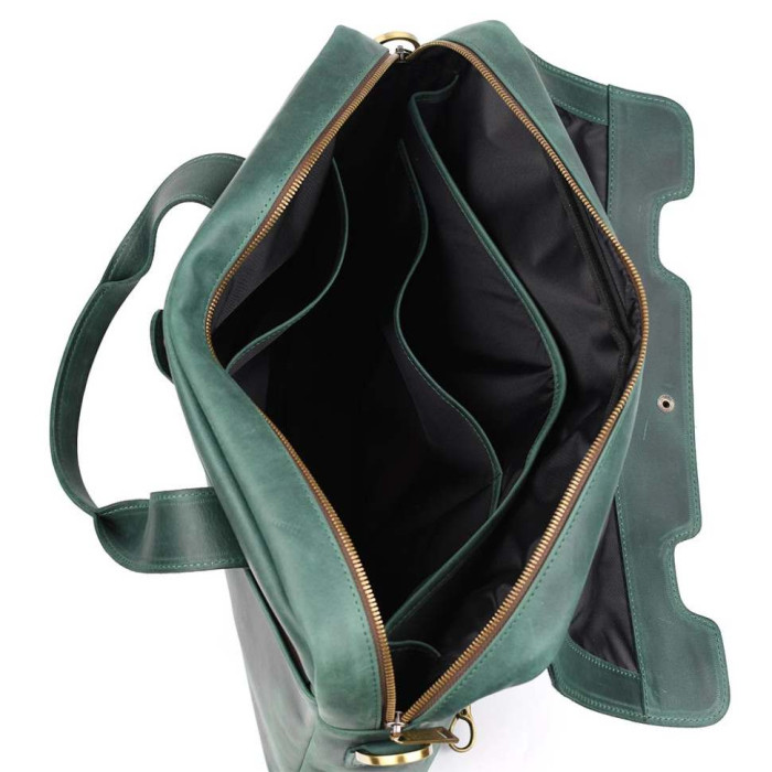Чоловіча сумка-портфель із натуральної шкіри зелена RE-1812-4lx TARWA від українського бренду TARWA. Виріб на одне відділення, всередині якого розміщується ущільнена відсік-кишеня для ноутбука до 15 дюймів. Ще, всередині Ви знайдете чотири відкриті кишені для телефону, портмоне або гаджетів, а також велику врізну кишеню на блискавці. Аксесуар застібається на блискавку, а зверху накривається коротеньким клапаном. На передній та задній стороні аксесуара – місткі кишені на блискавках. Дно виробу оснащене п'ятьма маленькими металевими ніжками, що захистить шкіру від передчасного стирання. Аксесуар зручно носити в руці, є дві короткі шкіряні ручки, а завдяки знімному плечовому ременю, що регулюється, - на плечі. Якісна та надійна брендована фурнітура золотистого кольору.