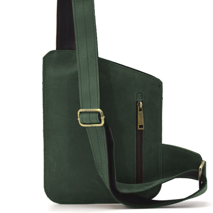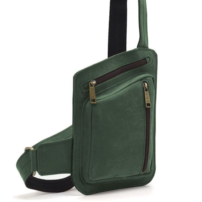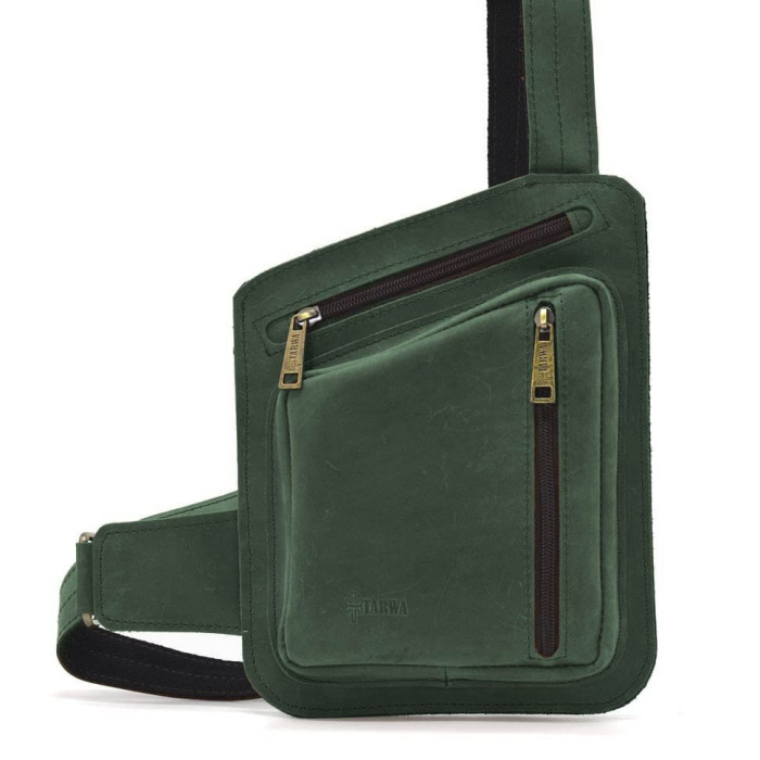 Шкіряна нагрудна сумка, рюкзак-слінг із кінської шкіри TARWA RE-235-3md у зеленому кольорі. Відкрита верхня кишеня без блискавки для швидкого доступу під праву руку. Шкіряний ремінь із регулюванням довжини. Усередині текстильна підкладка.