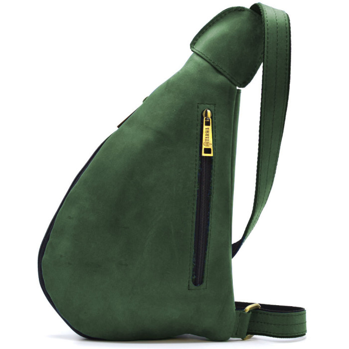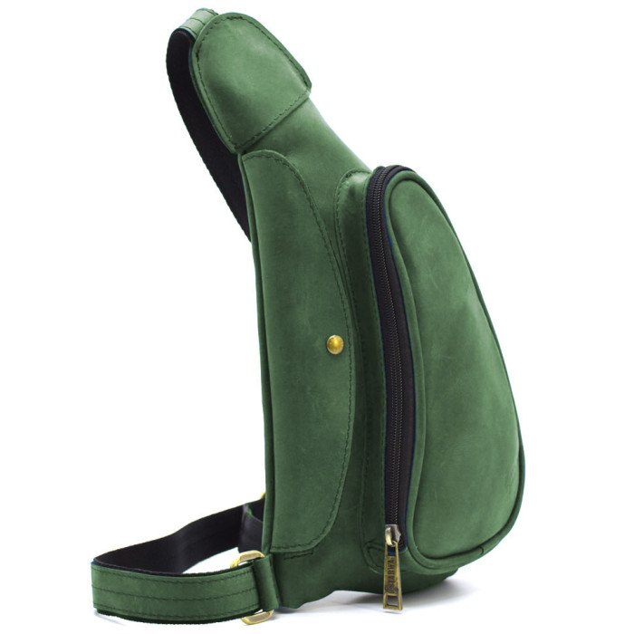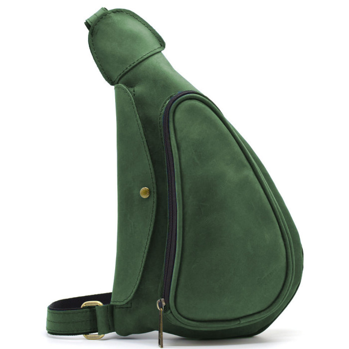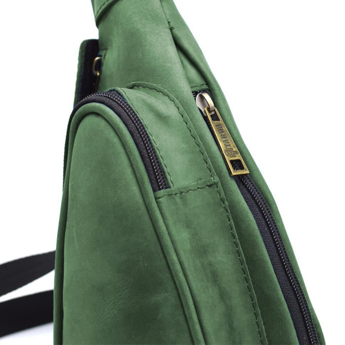 НагруднаЗелена сумка рюкзак слінг шкіряна на одне плече RE-3026-3md TARWA. Рюкзак може приховано носитись під теплим або об'ємним одягом. Відмінна риса цього рюкзака - це його вигнута, ергономічна форма, дизайн, що дозволяє комфортно використовувати рюкзак, для носіння під правою рукою на грудній клітці (контроль вмісту, приховане носіння).