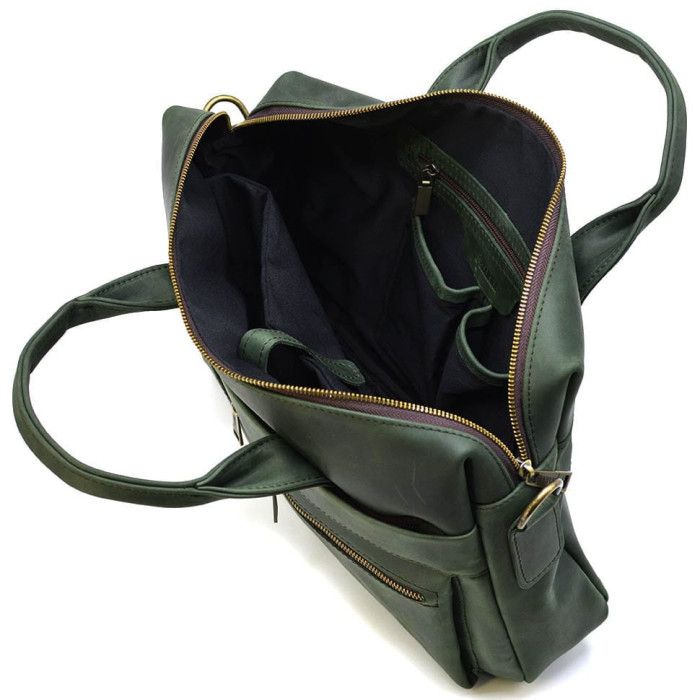 Виріб всередині має одне основне відділення з кишенями для портмоне, телефону плюс ущільнений відсік на липучці для ноутбука до 13". В основне відділення поміщається ноутбук 14".