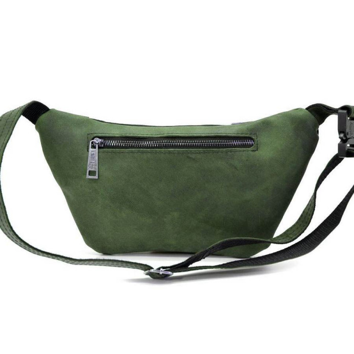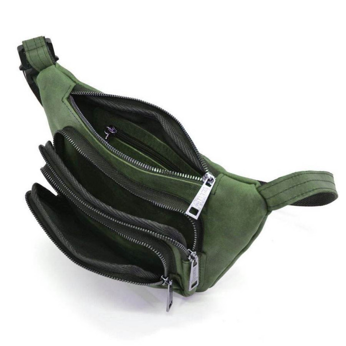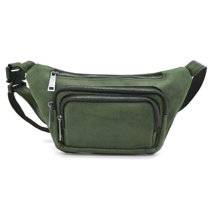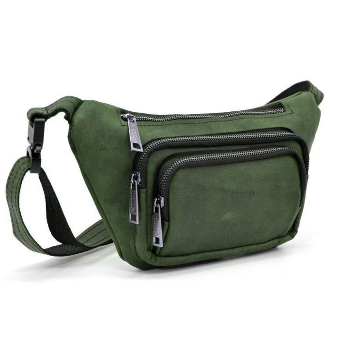 Зручна Зелена поясна сумка із кінської шкіри RE-8179-3md TARWA. Ваші документи, гроші та телефони під рукою у будь-якій ситуації. Зелена щільна шкіра крейзі хорс та фурнітура кольору темний нікель. Чотири кишені на блискавці на цій сумці, тканинний підклад всередині, тактичний швидкознімний фастекс.