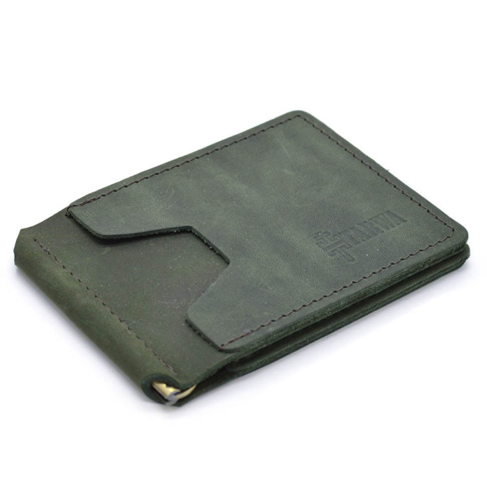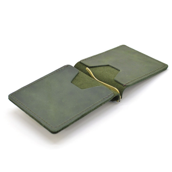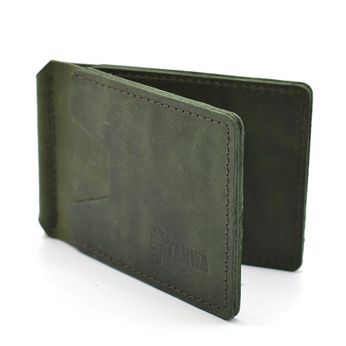 Стильний затиск шкіряний для купюр від українського виробника RЕ-hold-001 зеленого кольору TARWA. Аксесуар виготовлений із натуральної шкіри Crazy horse, ручної роботи. У даній моделі затиску TARWA всередині є гачок-затискач для купюр та 4 відділення для карток. Розмір затиску дозволяє легко поміститися в кишеню. Розмір 11,5 см на 8 см.
