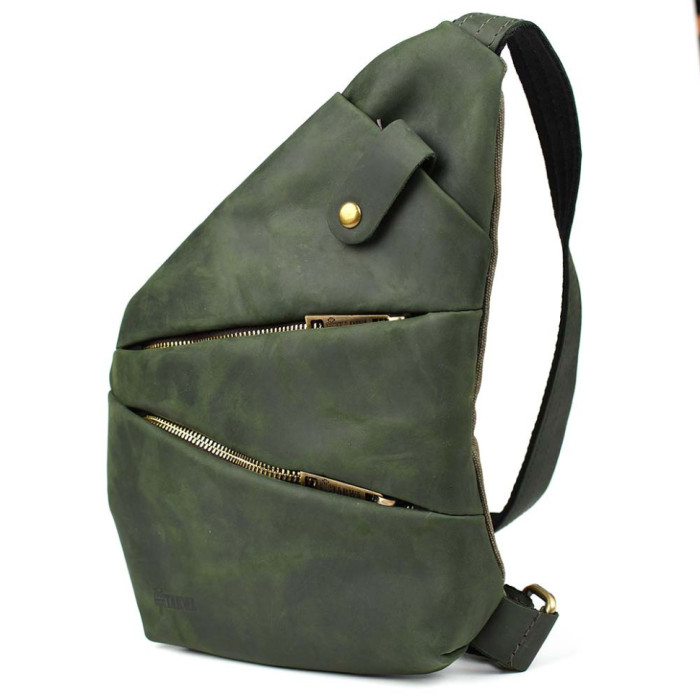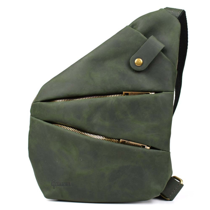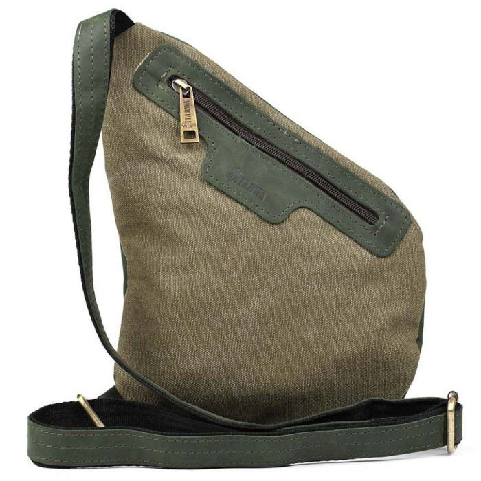 Чоловіча сумка-слінг через плече із поєднання канвасу та натуральної шкіри від українського бренду Tarwa. Задня частина сумки повністю тканинна, а лицьова сторона та ремінь навпаки вся зі шкіри. Виріб відрізняється оригінальним дизайном та максимальною функціональністю при носінні. Буде корисна у поїздках та подорожах. Складається з одного місткого відділення, що застібається на блискавку. На лицьовій стороні сумки розташовані дві горизонтальні кишені, що закриваються на блискавці, також зверху є маленька кишенька з хлястиком на кнопці. Ремінь (шлейка) двокомпонентний - складається зі шкіри та текстильної стропи для надання міцності та довговічності виробу. Ремінь регулюється за довжиною. Вся фурнітура та блискавки металеві.