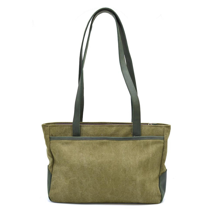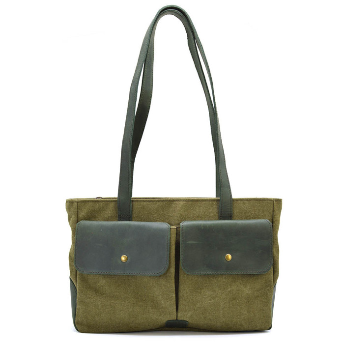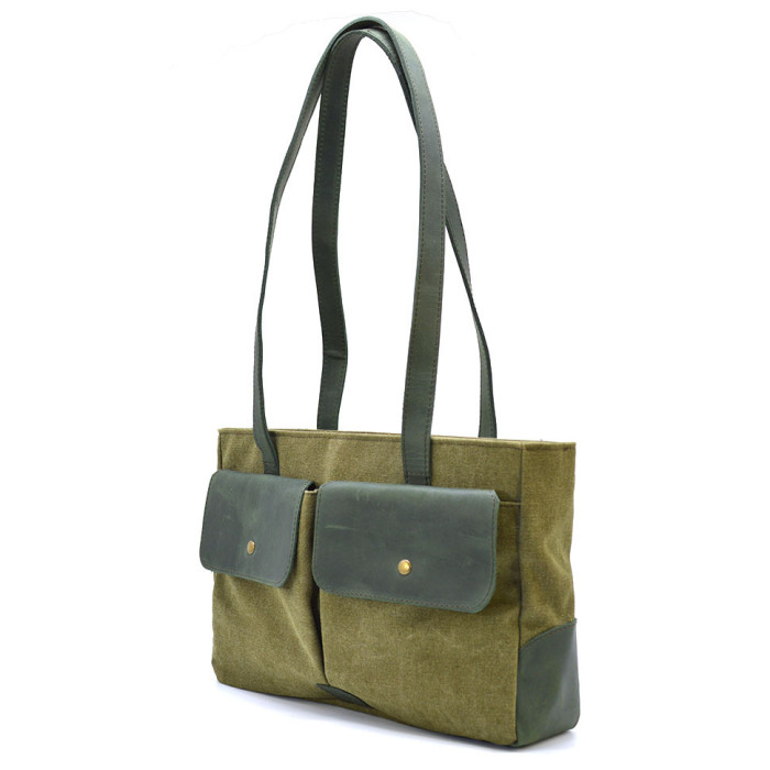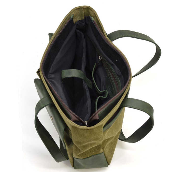 Жіноча сумка тоут з канвасу та шкіри TARWA REH-3930-3md з передніми кишенями з клапанами. Одне відділення на блискавці. Подовжені ручки для зручності носіння на плечі, повністю шкіряні. Всередині відділ для ноутбука, кишеня на блискавці, дві відкриті кишені