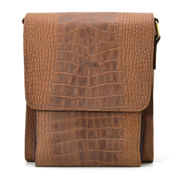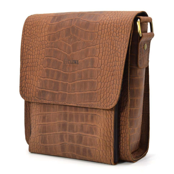 Крута вінтажна шкіра з пулл-ап ефектом (ефект старіння та подряпин) коричневого кольору з тисненням під рептилію.