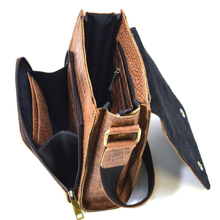 Виріб складається з одного відділення, всередині якого є кишеня на блискавці для особистих документів і ще одна накладна відкрита кишеня для телефону, наприклад. Сумка застібається на блискавку та зверху накривається клапаном з магнітною кнопкою. На клапані є гравіювання з логотипом виробника. Під клапаном розташовується практична, відкидна, містка кишеня на блискавці з внутрішніми шкіряними відсіками, для пластикових карток. На задній стороні виробу знаходиться ще одна кишеня на блискавці. Сумка наділена шкіряним ремінцем, що регулюється по довжині, з текстильною основою, що оберігає від розтягування.