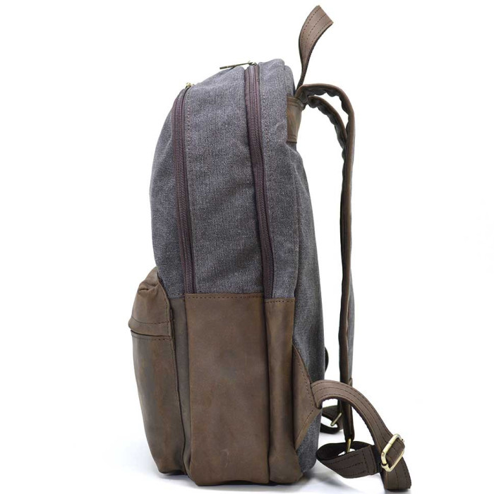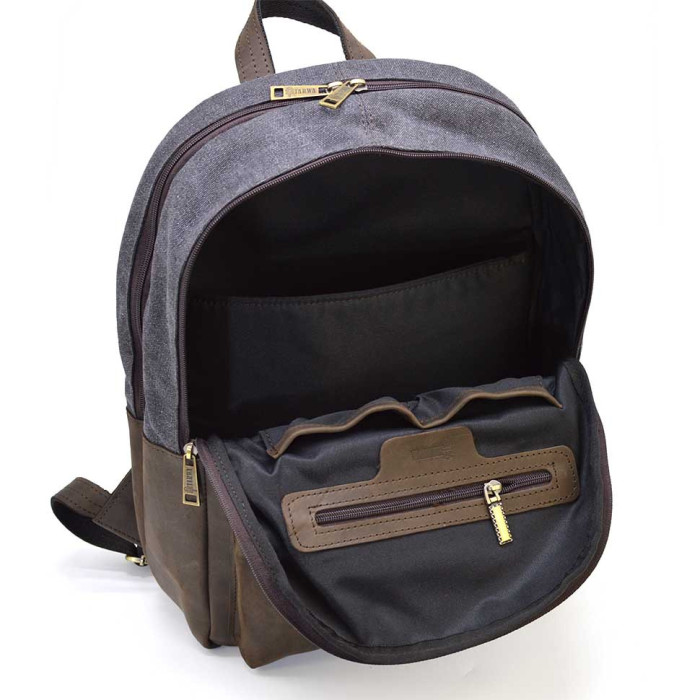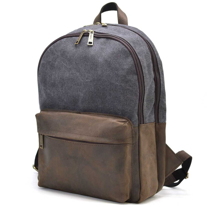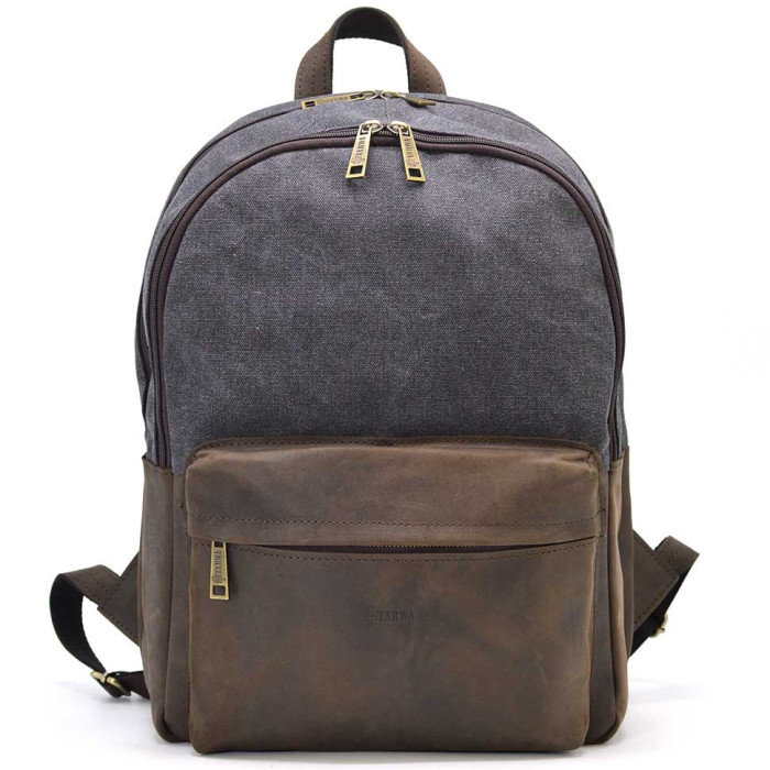 Чоловічий рюкзак шкіра і сірий канвас для ноутбука TARWA RGc-7273-3md на два відділення з вінтажної шкіри крейзі хорс. Два ізольованих відділення на блискавці. Комбіновані шлейки, передня кишеня, боковини. Розміри: 40×31×13 см. Український виробник TARWA. Універсальний рюкзак, який підходить для кожного дня, для поїздок, роботи, прогулянок. Достатньо місткий, має: