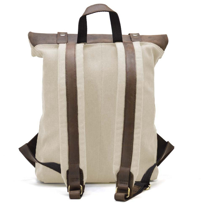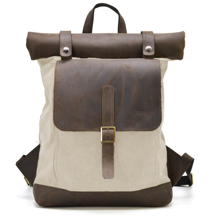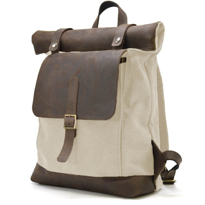 Ролл-ап рюкзак зі шкіри та канвас TARWA RGj-5191-3md слонова кістка - рюкзак зі верхньою горловиною, що скручується. Закривається основне відділення на блискавку плюс скручування з двома шкіряними фіксаторами з боків.