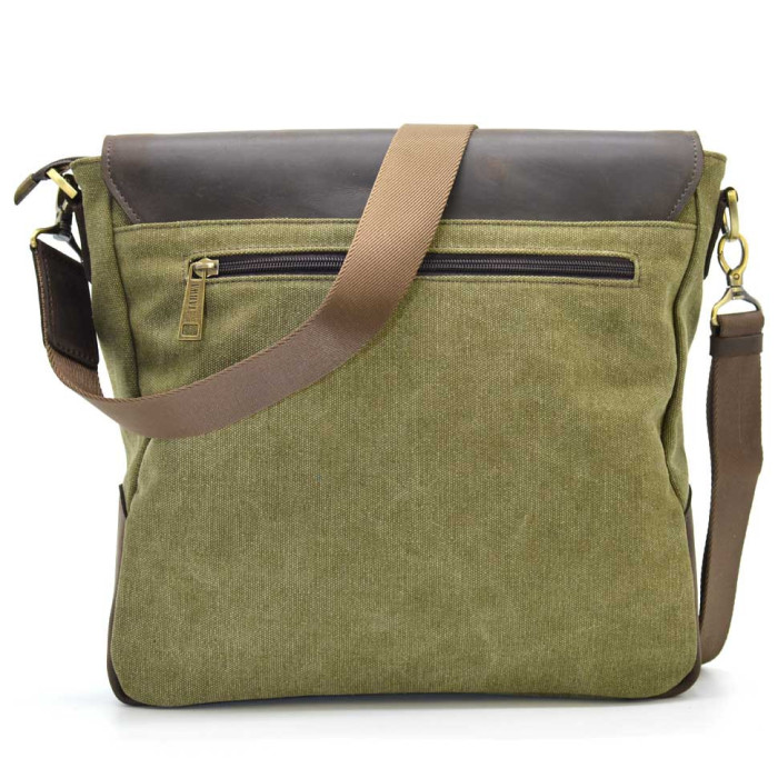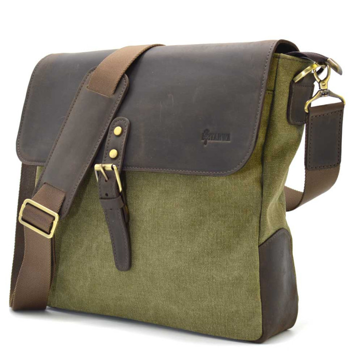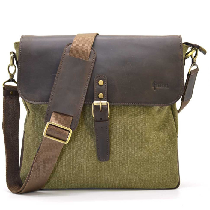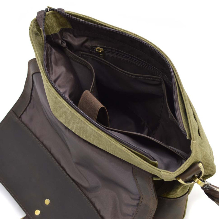 Сумка через плече з парусини хаккі та кінської шкіри RH-6600-4lx TARWA. Зручний варіант для роботи, навчання чи поїздок. Вміщує формат А4. Виріб на відділення з внутрішнім ущільненим відсіком на липучці для планшета або документів. Усередині є дві відкриті невеликі кишені для телефону та портмоне, ще містка кишеня на блискавці для цінних предметів. На задній стороні сумки розташовуються дві величезні плоскі кишені: одна на блискавці, і друга на магнітній кнопці. А також під клапаном ще є велика відкрита кишеня. Месенджер застібається на блискавку і зверху накривається шкіряним клапаном з ремінцем та магнітом. Кути денця сумки через плече RH-6600-4lx TARWA укріплені шкірою. На шкіряному клапані, який застібається на магнітну кнопку і прикрашений хлястиком, є гравіювання з логотипом бренду. У комплектацію входить знімний плечевий ремінь.