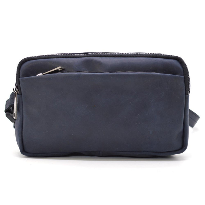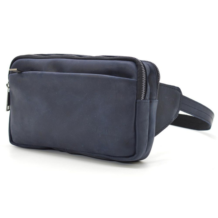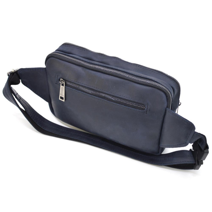 Напоясна сумка на два відділення TARWA RK-0704-3md синій крейзі кінська шкіра (блискавка колір – антик – нікель) з фастексом від українського бренду TARWA. Якісний стильний аксесуар на кожен день у мегаполісі, поїздці та на прогулянці. Виготовлена із телячої шкіри високої якості. Колір чорний. Два окремі великі відділення застібаються на блискавці з металевими практичними застібками (пулерами). Є зовнішня кишеня поменше, що також застібається на блискавку. З внутрішньої сторони є кишеня для найцінніших речей. Ремінь повністю зі шкіри та текстильної основи. Застібка (фастекс) металева, швидкознімна, застосовується у військовій амуніції, альпінізмі. Текстильна міцна підкладка.