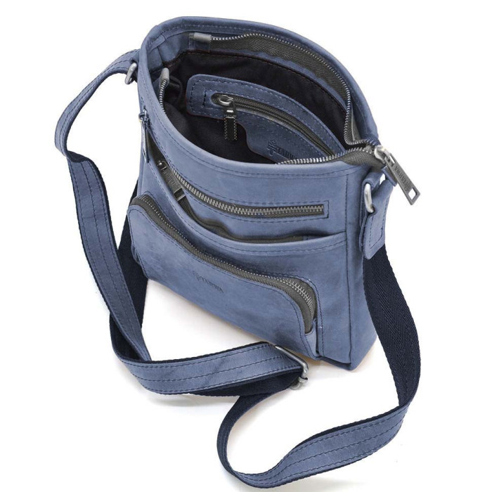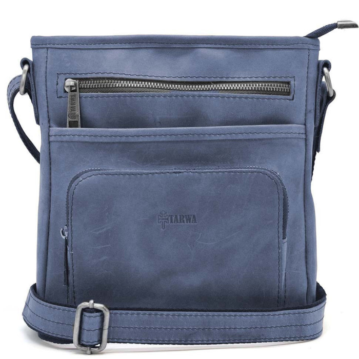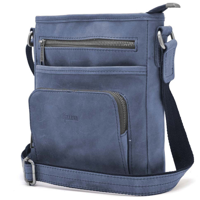 Чоловіча шкіряна сумка RK-1303-3md TARWA синя з кінської шкіри крейзі хорс від українського бренду TARWA. Виріб на одне відділення, яке застібається на блискавку. Може вміщувати планшет. Усередині є кишені для дрібних особистих речей: дві відкриті накладні і одна врізна на блискавці. На обох зовнішніх сторонах аксесуара розташовуються кишені на блискавці. У виробі використано міцну тканинну підкладку. Сумочку можна носити на плечі завдяки зручному плечовому шкіряному ременю, що регулюється. Блискавка - антик