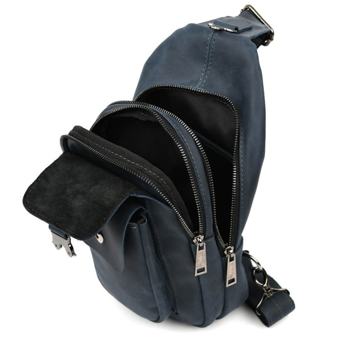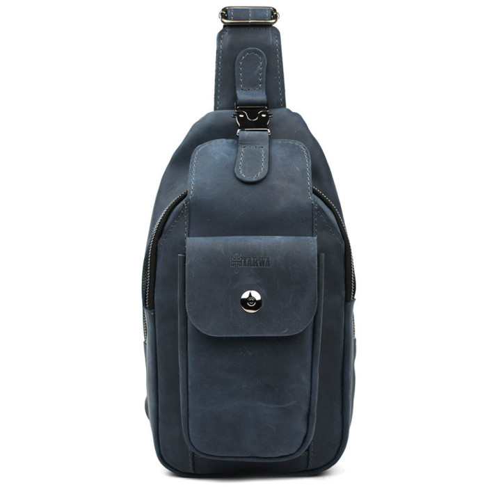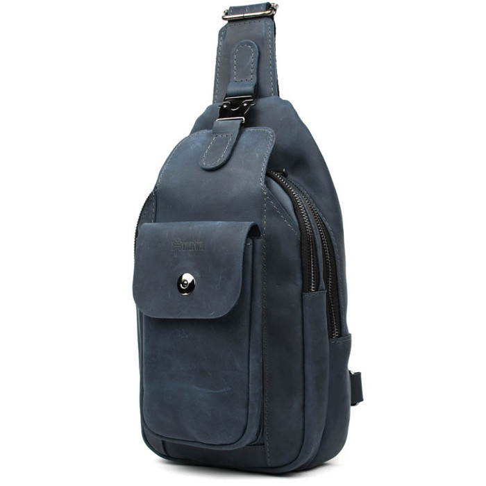 Модний рюкзак на моношлейці із натуральної телячої шкіри TARWA RK-4007-3md виготовлений з високоякісної натуральної кінської шкіри класичного синього кольору з оригінальною фактурою на дотик.