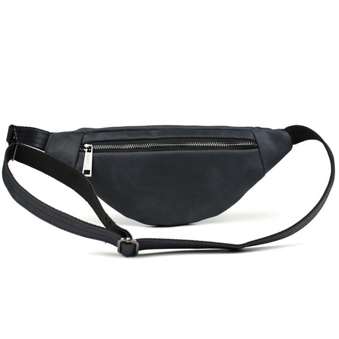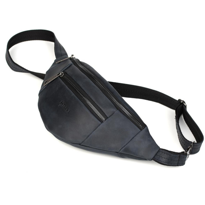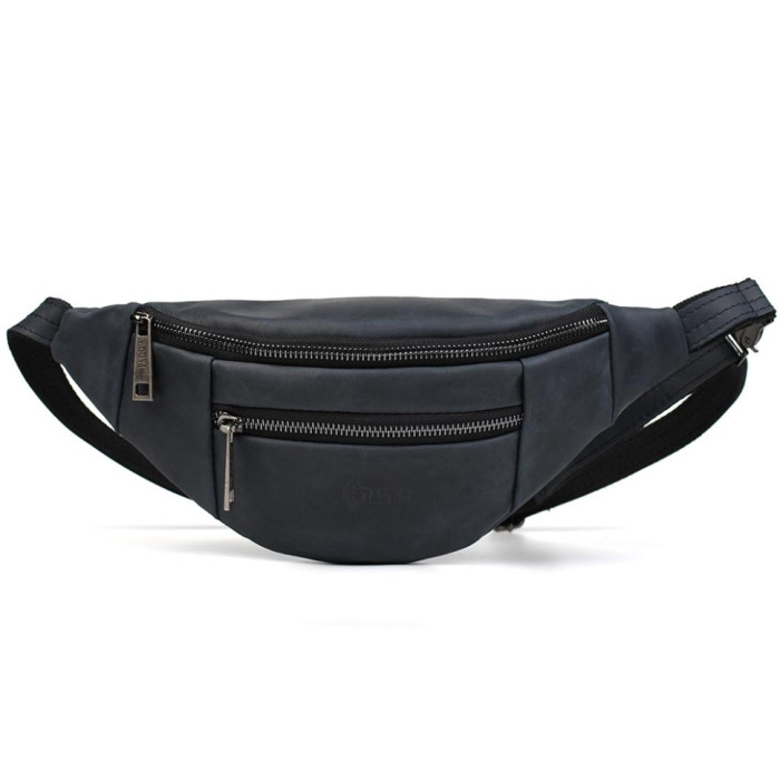 Шкіряна бананка 8040 від TARWA пошита таким чином, що має два основні відділення: переднє об'ємне та заднє плоске для телефону або документів.