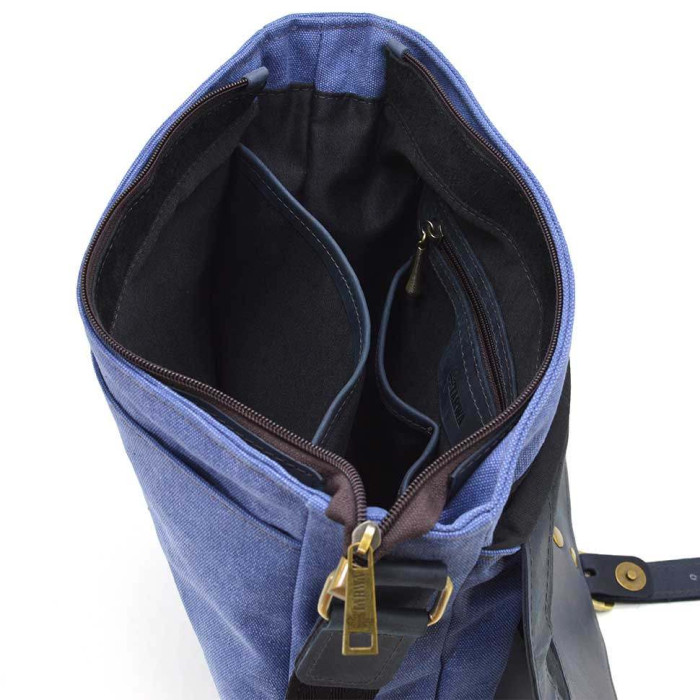 Зручний варіант для роботи, навчання чи поїздок. Вміщує формат А4. Виріб одного відділення з внутрішнім відсіком для планшета або документів. Усередині є дві відкриті невеликі кишені для телефону та портмоне, ще містка кишеня на блискавці для цінних предметів. На задній стороні сумки розташовуються дві величезні плоскі кишені: одна на блискавці, і друга на магнітній кнопці. А також під клапаном ще є велика відкрита кишеня. Месенджер застібається на блискавку і зверху накривається шкіряним клапаном з ремінцем та магнітом. Кути денця сумки укріплені шкірою. На шкіряному клапані, який застібається на магнітну кнопку і прикрашений хлястиком, є гравіювання з логотипом бренду. У комплектацію входить знімний плечовий ремінь.