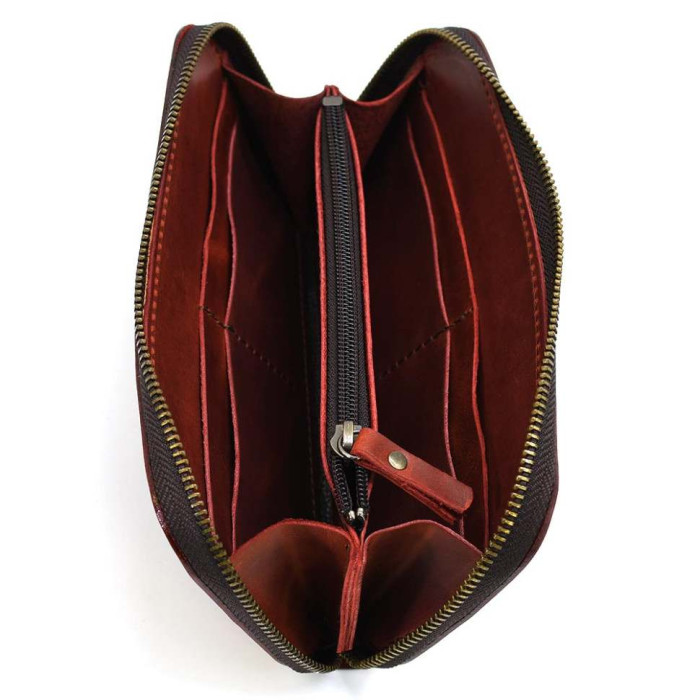 Усередині два відділи для купюр, середня кишеня-перегородка на блискавці для монет, слоти для карток з боків – лише 8 слотів.