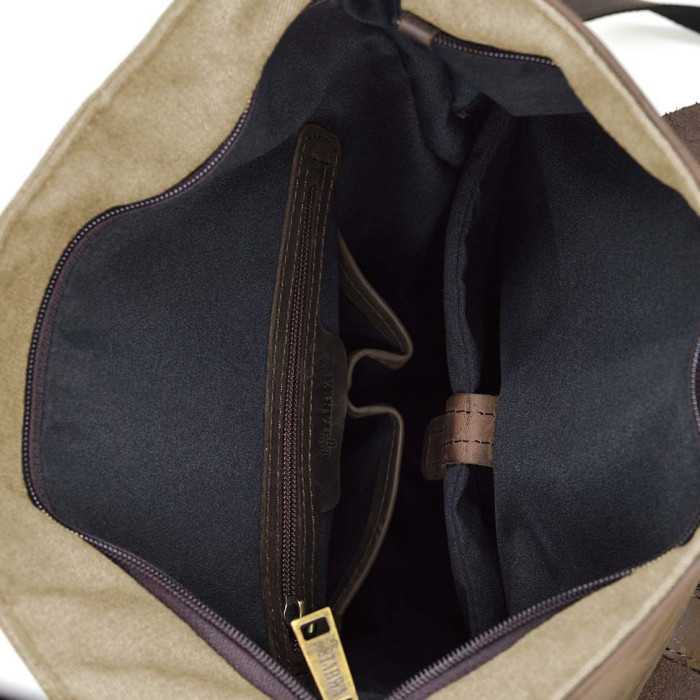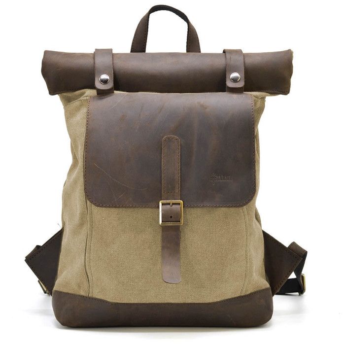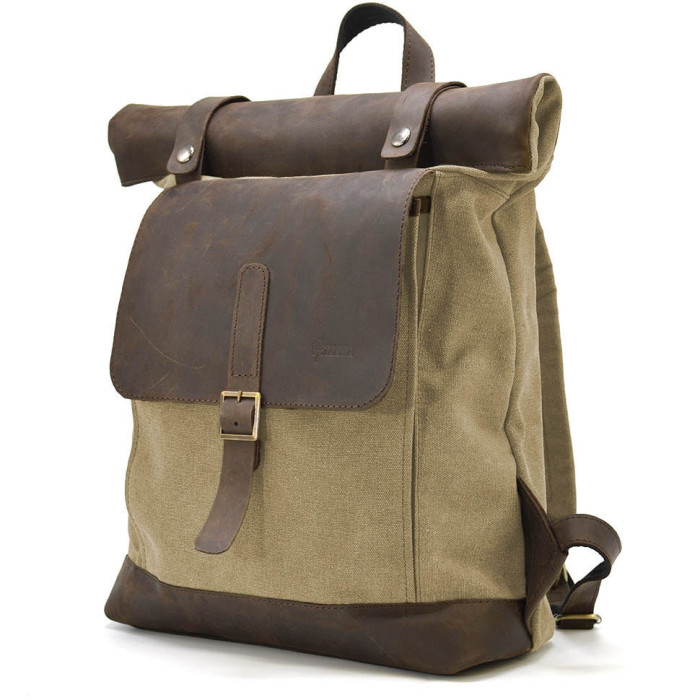 Рол-ап рюкзак зі шкіри та пісочний канвас TARWA RSc-5191-3md - рюкзак зі верхньою горловиною, що скручується. Закривається основне відділення на блискавку плюс скручування з двома шкіряними фіксаторами з боків.