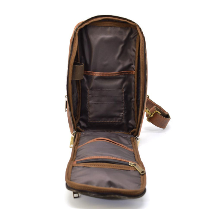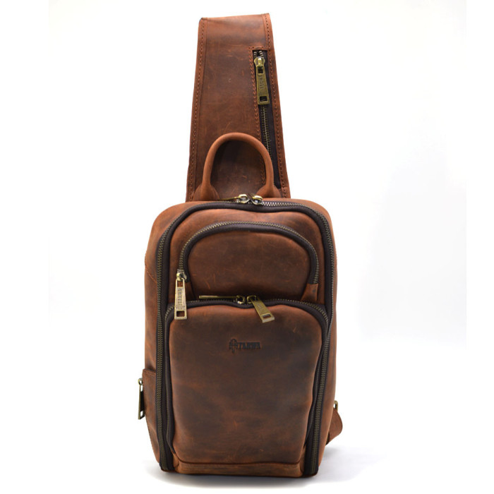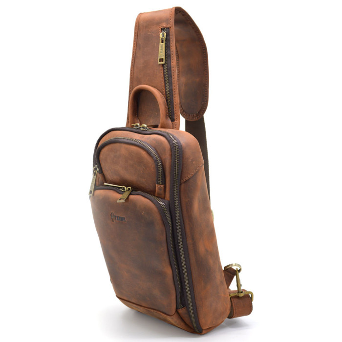 Шкіряний рюкзак слінг на одне плече TARWA RY-0910-4lx. Стильний аксесуар виготовлений з натуральної шкіри Crazy horse, у терракотовому (коньячному) кольорі. Невеликий розмір рюкзак призначений для повсякденного використання. Основне відділення відчиняється на всю ширину. Усередині безліч кишень, органайзерів. Передня кишеня на блискавці. Шлейка перестібається як на ліву, так і праву руку. Стильний аксесуар виготовлений із натуральної шкіри Crazy horse, у коричневому кольорі. Середній розмір рюкзак призначений для повсякденного використання. Його можна взяти із собою у поїздку.