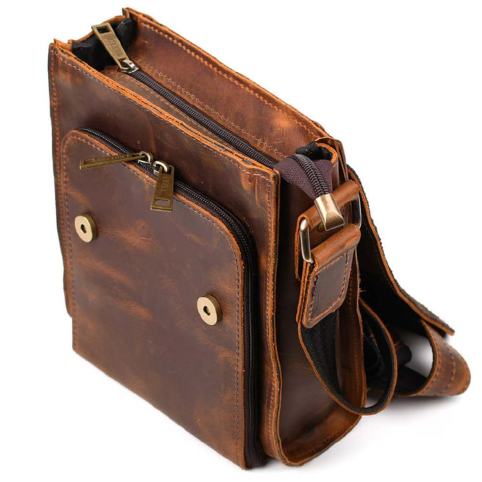 Виріб складається з одного відділення, всередині якого є кишеня на блискавці для особистих документів і ще одна накладна відкрита кишеня для телефону, наприклад. Сумка застібається на блискавку та зверху накривається клапаном з магнітною кнопкою. На клапані є гравіювання з логотипом виробника. Під клапаном розташовується практична, відкидна, містка кишеня на блискавці з внутрішніми шкіряними відсіками, для пластикових карток. На задній стороні виробу знаходиться ще одна кишеня на блискавці. Сумка наділена шкіряним ремінцем, що регулюється по довжині, з текстильною основою, що оберігає від розтягування.