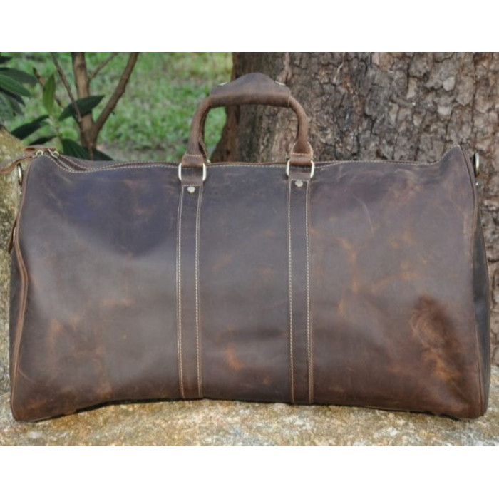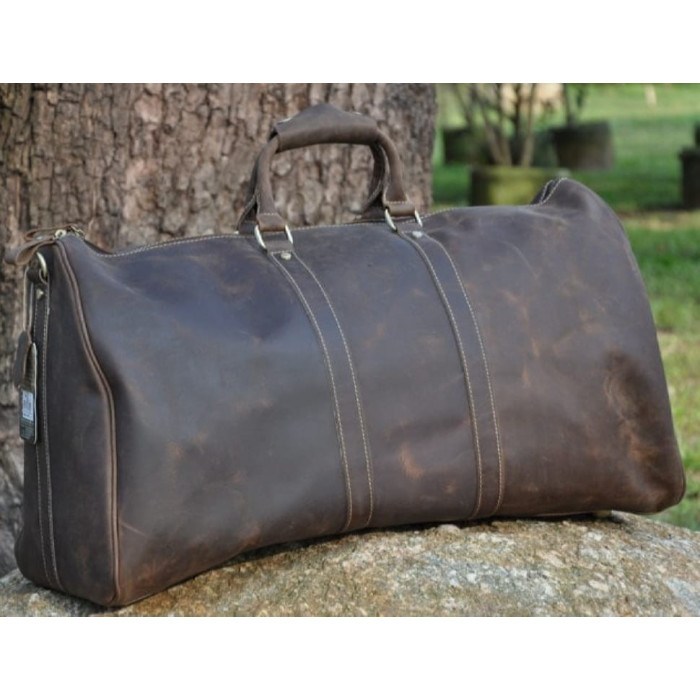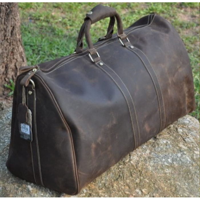 Велика вінтажна дорожня сумка з кінської шкіри Матеріали: 100% натуральна кінська шкіра, вінтажна шкіра (вироблення "під старовину") Розміри: w60 x h38 x d25 см Вага: 2,1 кг Колір коричневий Фурнітура: метал, відтінку латуні Внутрішнє оздоблення: міцна лляна тканина гармонійного кольору Застібка: зустрічна металева блискавка. Жорстке укріплене дно на п'яти металевих ніжках для захисту шкіри від пошкоджень Опис: одне велике основне відділення, відділення для ноутбука, 3 кишені для телефону, документів і портмоне. Великий бокова кишеня на блискавці Місткий стильний дорожній аксесуар, тревелбег з натуральної шкіри. Спеціальне відділення для ноутбука з діагоналлю до 15`` (включно) з ремінцем-фіксатором на липучці! Комфортні для носіння посилені шкіряні ручки на металевих кільцях з додатковим ремінцем на двох металевих кнопках, який фіксує ручки разом. Зручний знімний ремінь на плече з регульованою довжиною, двосторонній (натуральна шкіра + текстиль) Додатково - знімна бирка для багажу на шкіряному ремінці Кріпиться на ручку сумки за допомогою металевої пряжки