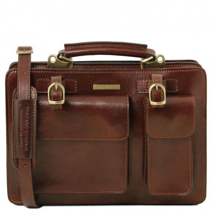 Велика шкіряна сумка Tuscany Leather Taniaпредставляє мінімалістичний фасон для витонченої ділової леді. Класичний стиль грамотно поєднується з офісним варіантом. Італійський бренд продумав всі деталі. Натуральна теляча шкіра і жорстка конструкція поселяють в атмосферу успіху, екстравагантності. Всередині присутня бавовняна підкладка. Два відділення доповнюють два накладних багатофункціональних кишені на магнітних кнопках (наприклад, для ключів або смартфона). Вміст сумки закривається на металевий замок. На передній частині можна закріпити газету або парасольку за допомогою спеціальних ремінців. Міцна шкіряна ручка дозволяє носити аксесуар в руці, а знімний ремінь - на плечі. Розкішний образ успішної жінки - головне гасло шкіряного вироби. Купити шкіряну сумку портфельTuscany Leather Tania можна онлайн, не виходячи з дому.