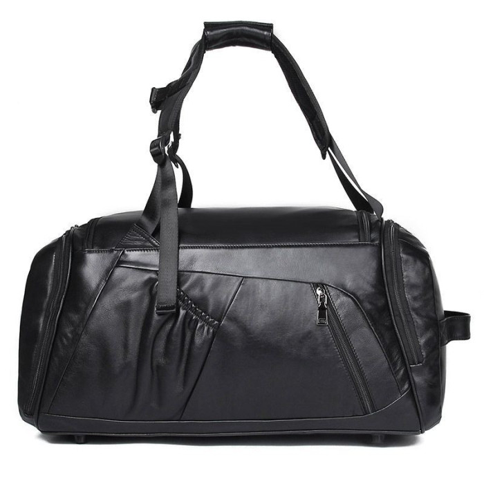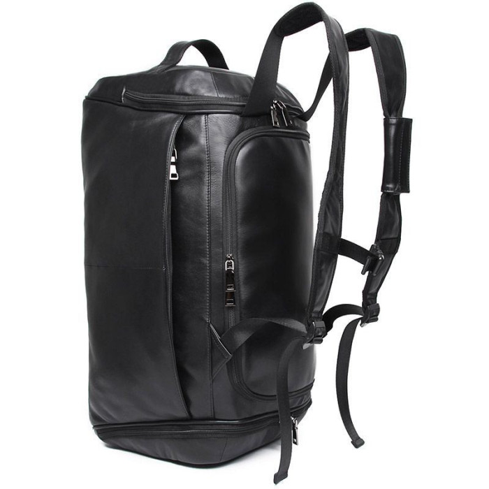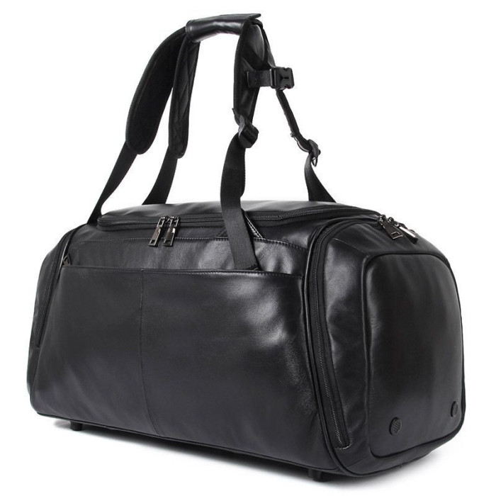 Велика дорожня сумка X-6010A з натуральної телячої шкіри вищого сорту, від бренду John McDee. Аксесуар являє собою сумку-рюкзак, і буде корисний в далеких поїздках, коли потрібно брати з собою багато речей. Виріб має дуже містке основне відділення з трьома внутрішніми кишенями: один виразний, і два відкритих. На торцях сумки, з обох сторін, розташовані бічні відсіки, що застібаються на блискавки. В одному з них зручно перевозити взуття, тому що є спеціальні металеві отвори для провітрювання вироби. На зовнішніх сторонах аксесуара присутні, з одного боку величезний виразний кишеню з блискавкою, а на іншій - маленький виразний і відкритий кишені. Усередині міцний тканинний подклад. Сумка має жорстке укріплене дно на п'яти пластикових ніжках для захисту шкіри від пошкоджень. Аксесуар наділений маленької шкіряною ручкою, а також двома довгими шкіряними ручками, які дозволяють носити сумку на плечі. Також ці довгі ручки можна використовувати як шлейки рюкзака, досить тільки відрегулювати їх довжину.