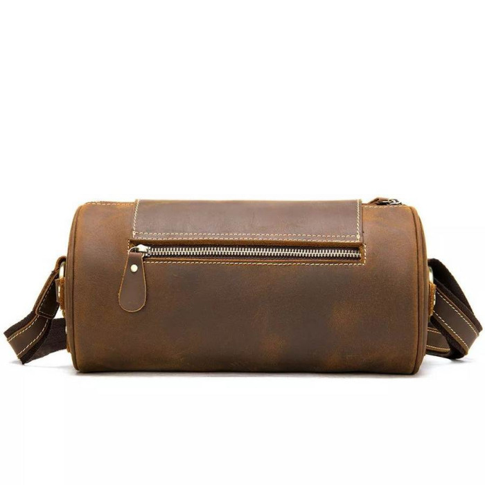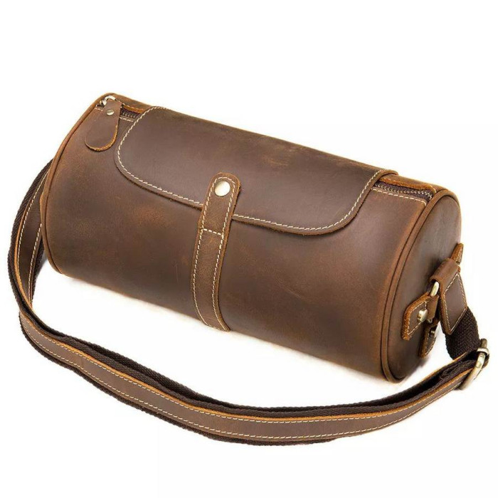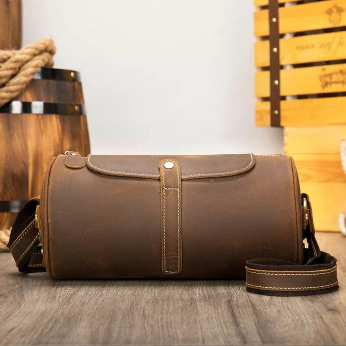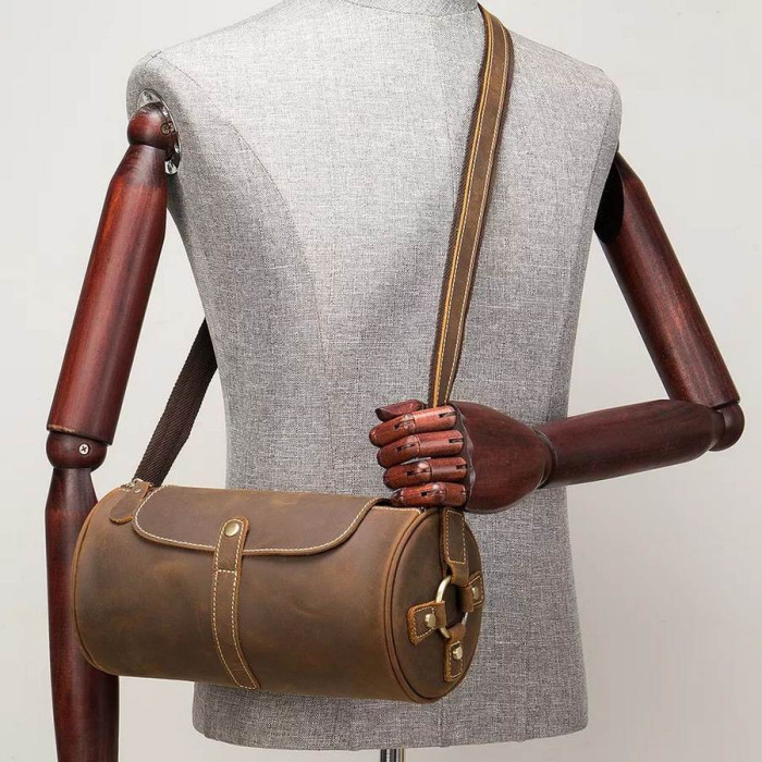 Рідкісна вінтажна (під старовину) сумка з кінської шкіри у вигляді тубуса або бочки. Має одне основне відділення з шкіряним клапаном на кнопці. Усередині потайну кишеню для документів. На тильній стороні кишеню на блискавці для часто необхідних речей. Сумка має шкіряний ремінь через плече на текстильній основі. Добротна металева фурнітура і заклепки.